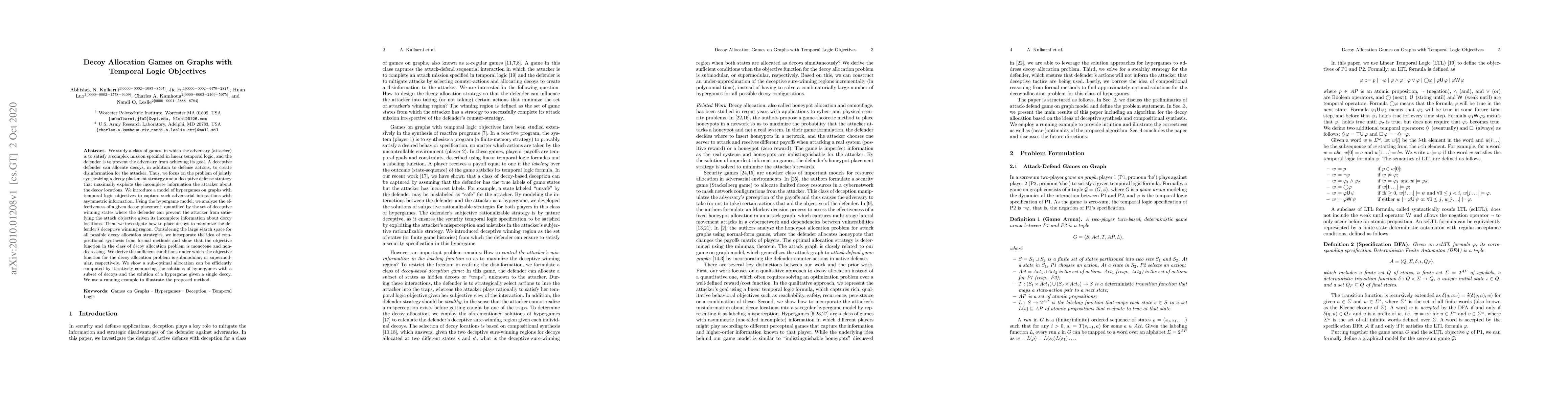 We study a class of games, in which the adversary (attacker) is to satisfy a complex mission specified in linear temporal logic, and the defender is to prevent the adversary from achieving its goal. A deceptive defender can allocate decoys, in addition to defense actions, to create disinformation for the attacker. Thus, we focus on the problem of jointly synthesizing a decoy placement strategy and a deceptive defense strategy that maximally exploits the incomplete information the attacker about the decoy locations. We introduce a model of hypergames on graphs with temporal logic objectives to capture such adversarial interactions with asymmetric information. Using the hypergame model, we analyze the effectiveness of a given decoy placement, quantified by the set of deceptive winning states where the defender can prevent the attacker from satisfying the attack objective given its incomplete information about decoy locations. Then, we investigate how to place decoys to maximize the defender's deceptive winning region. Considering the large search space for all possible decoy allocation strategies, we incorporate the idea of compositional synthesis from formal methods and show that the objective function in the class of decoy allocation problem is monotone and non-decreasing. We derive the sufficient conditions under which the objective function for the decoy allocation problem is submodular, or supermodular, respectively. We show a sub-optimal allocation can be efficiently computed by iteratively composing the solutions of hypergames with a subset of decoys and the solution of a hypergame given a single decoy. We use a running example to illustrate the proposed method.