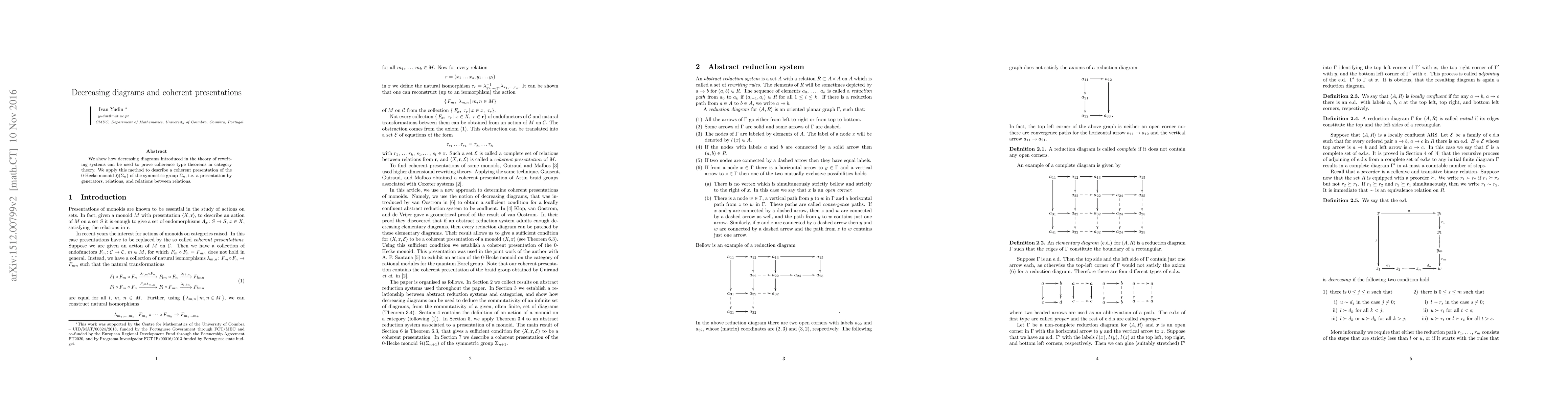 We show how decreasing diagrams introduced in the theory of rewriting systems can be used to prove coherence type theorems in category theory. We apply this method to describe a coherent presentation of the $0$-Hecke monoid $\mathcal{H}(\Sigma_n)$ of the symmetric group $\Sigma_n$, i.e. a presentation by generators, relations, and relations between relations.