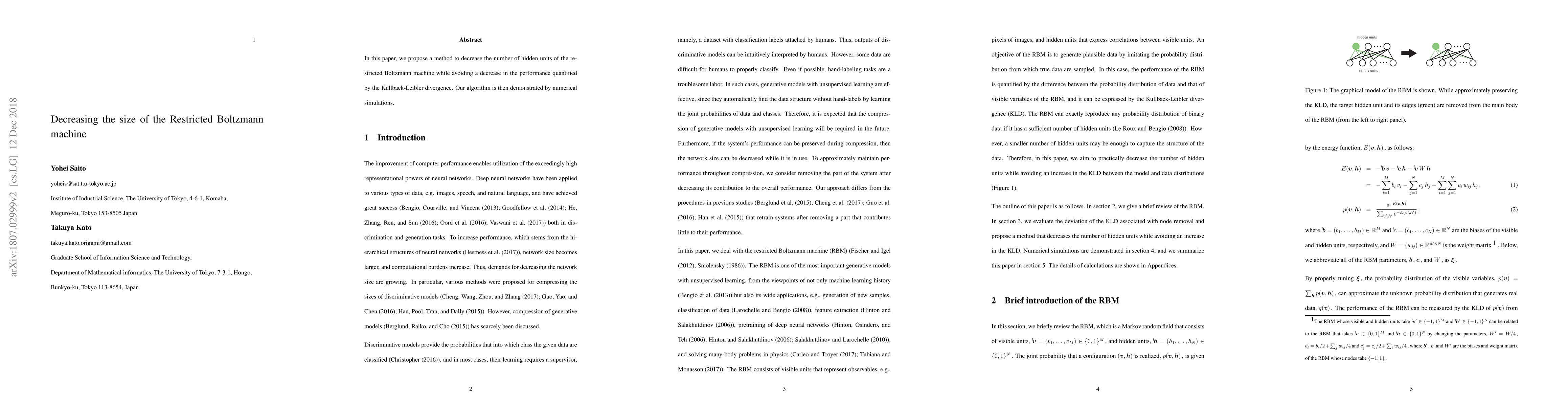 We propose a method to decrease the number of hidden units of the restricted Boltzmann machine while avoiding decrease of the performance measured by the Kullback-Leibler divergence. Then, we demonstrate our algorithm by using numerical simulations.