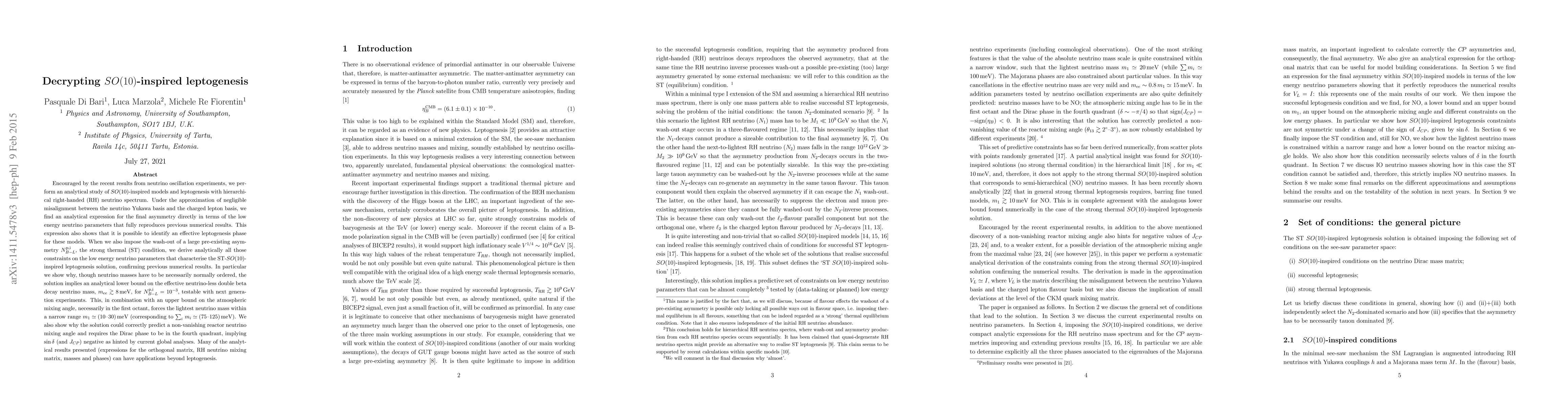 The research demonstrates the potential for SO(10)-inspired models to explain high-energy scale leptogenesis and provides constraints on low-energy neutrino parameters.