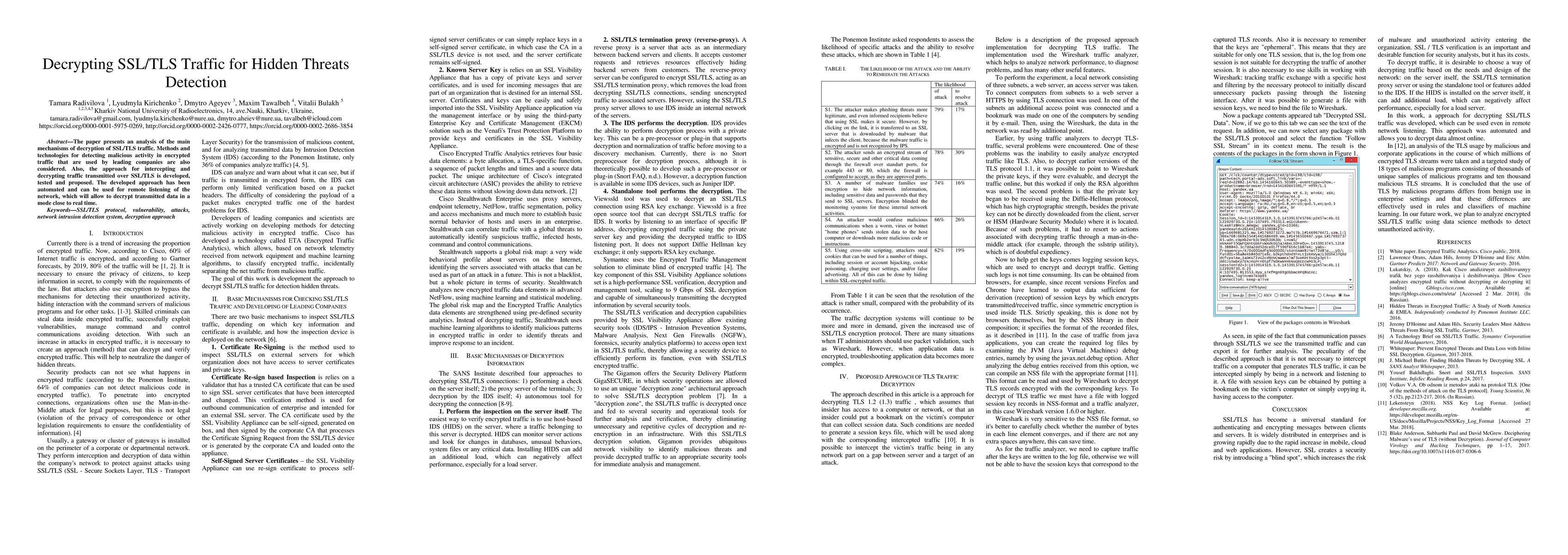 This paper analyzes decryption methods for SSL/TLS traffic and proposes an automated approach for intercepting and decrypting encrypted data, enabling real-time detection of hidden threats in network communications.