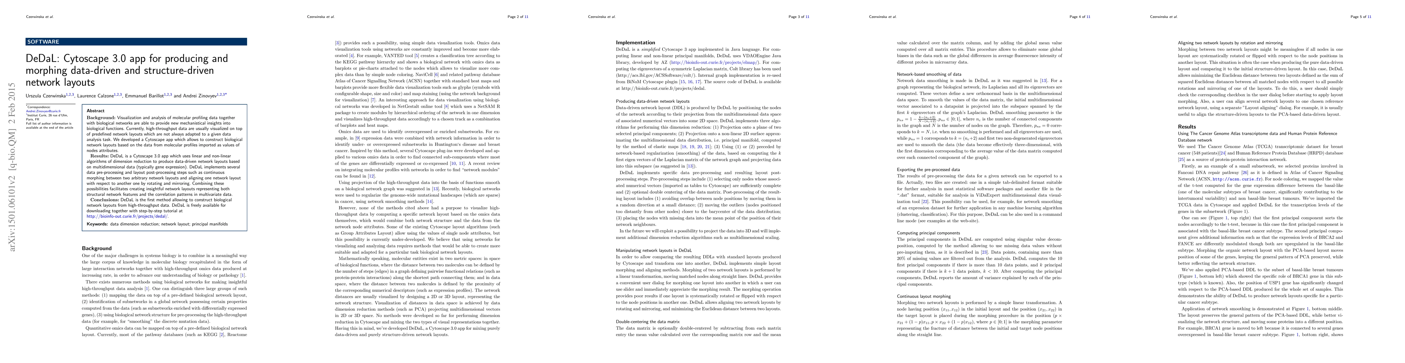 DeDaL is a Cytoscape 3.0 app designed to generate and morph network layouts based on both data-driven and structural network features, facilitating insights into biological functions from molecular profiling data. It employs dimension reduction algorithms and morphing techniques to create layouts that reflect both structural and correlation patterns in high-throughput data.