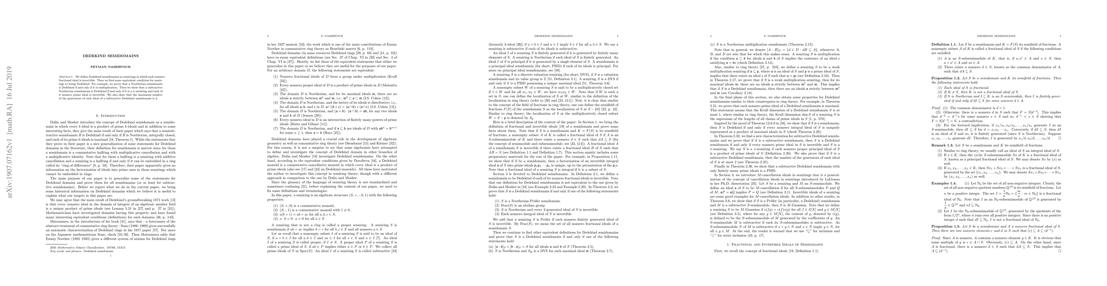 The paper defines Dedekind semidomains as semirings where nonzero fractional ideals are invertible. It establishes conditions for a semidomain to be Dedekind, such as being Noetherian and multiplication, or subtractive Noetherian and a $pi$-semiring with invertible prime ideals. It also proves that every ideal in a subtractive Dedekind semidomain can be generated by at most two elements.