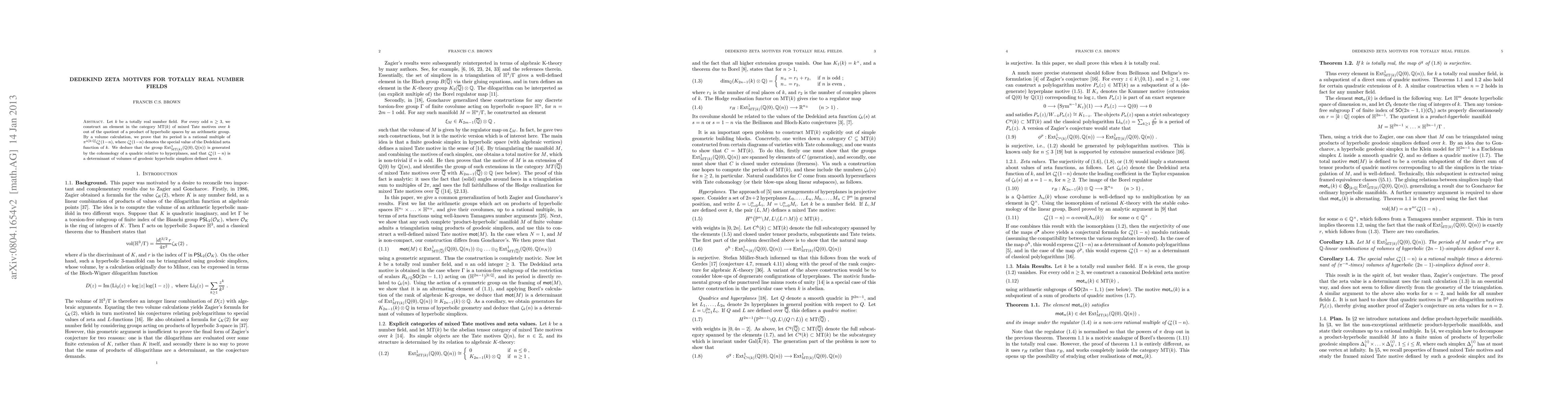 This paper constructs Dedekind zeta motives for totally real number fields and proves that their periods relate to special values of the Dedekind zeta function. It also shows that $\Ext^1_{\MT(k)} (\Q(0),\Q(n))$ is generated by the cohomology of a quadric relative to hyperplanes, supporting a conjecture on motivic complexes.
