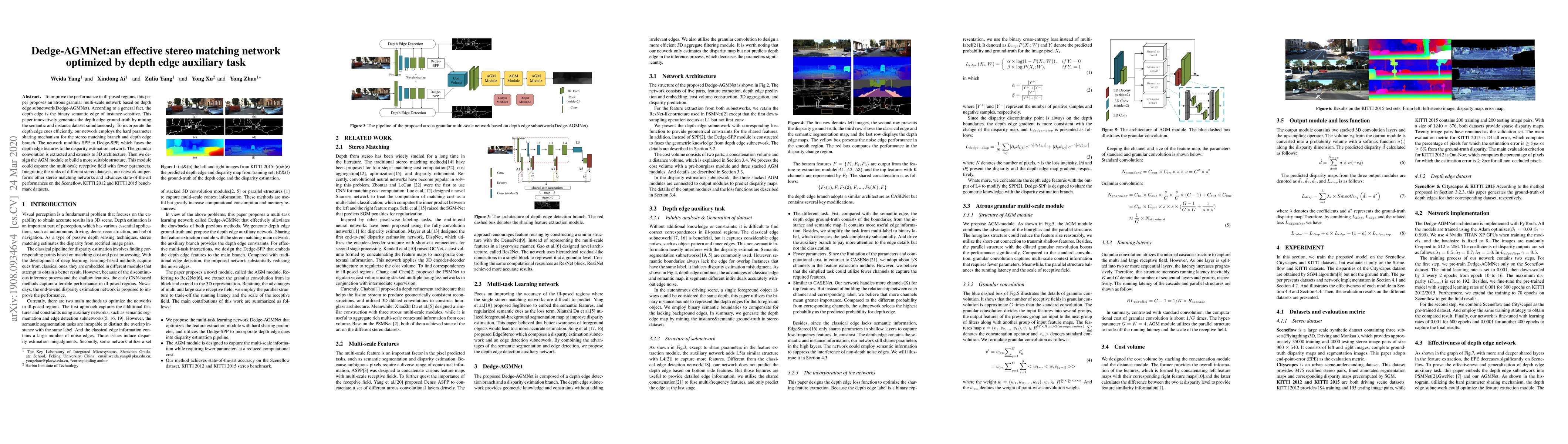 The paper introduces Dedge-AGMNet, an atrous granular multi-scale network enhanced by a depth edge auxiliary task, which generates depth edge ground-truth from semantic and instance datasets to improve stereo matching performance in ill-posed regions. The network employs hard parameter sharing and a modified Dedge-SPP module to integrate depth edge features, achieving superior performance on benchmark datasets.