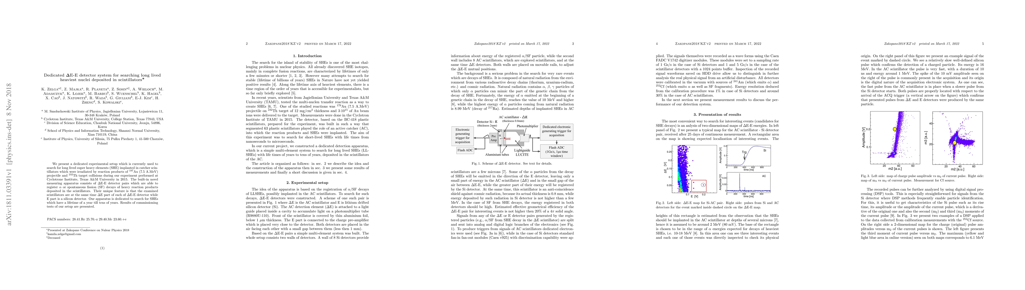 We present a dedicated experimental setup which is currently used to search for long lived super heavy elements (SHE) implanted in catcher scintillators which were irradiated by reaction products of $^{197}$Au (7.5 A.MeV) projectile and $^{232}$Th target collisions during our experiment performed at Cyclotrone Institute, Texas A$\&$M University in 2015. The built-in novel measuring apparatus consists of $\Delta$E-E detector pairs which are able to register $\alpha$ or spontaneous fission (SF) decays of heavy reaction products deposited in the scintillators. Their unique feature is that the examined scintillators are at the same time $\Delta$E part of each of $\Delta$E-E detector while E part is a silicon detector. Our apparatus is dedicated to search for SHEs which have a lifetime of a year till tens of years. Results of commissioning tests of our setup are presented.