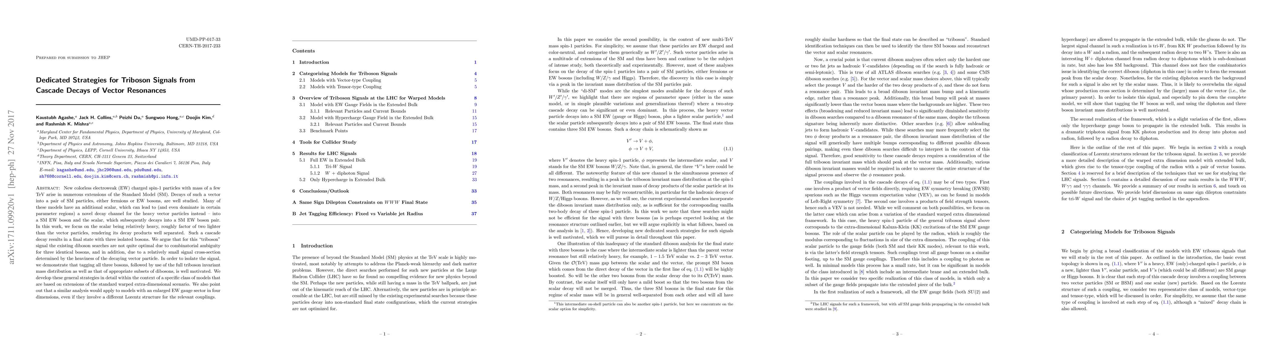 New colorless electroweak (EW) charged spin-1 particles with mass of a few TeV arise in numerous extensions of the Standard Model (SM). Decays of such a vector into a pair of SM particles, either fermions or EW bosons, are well studied. Many of these models have an additional scalar, which can lead to (and even dominate in certain parameter regions) a novel decay channel for the heavy vector particles instead - into a SM EW boson and the scalar, which subsequently decays into a SM EW boson pair. In this work, we focus on the scalar being relatively heavy, roughly factor of two lighter than the vector particles, rendering its decay products well separated. Such a cascade decay results in a final state with three isolated bosons. We argue that for this "triboson" signal the existing diboson searches are not quite optimal due to combinatorial ambiguity for three identical bosons, and in addition, due to a relatively small signal cross-section determined by the heaviness of the decaying vector particle. In order to isolate the signal, we demonstrate that tagging all three bosons, followed by use of the full triboson invariant mass distribution as well as that of appropriate subsets of dibosons, is well motivated. We develop these general strategies in detail within the context of a specific class of models that are based on extensions of the standard warped extra-dimensional scenario. We also point out that a similar analysis would apply to models with an enlarged EW gauge sector in four dimensions, even if they involve a different Lorentz structure for the relevant couplings.