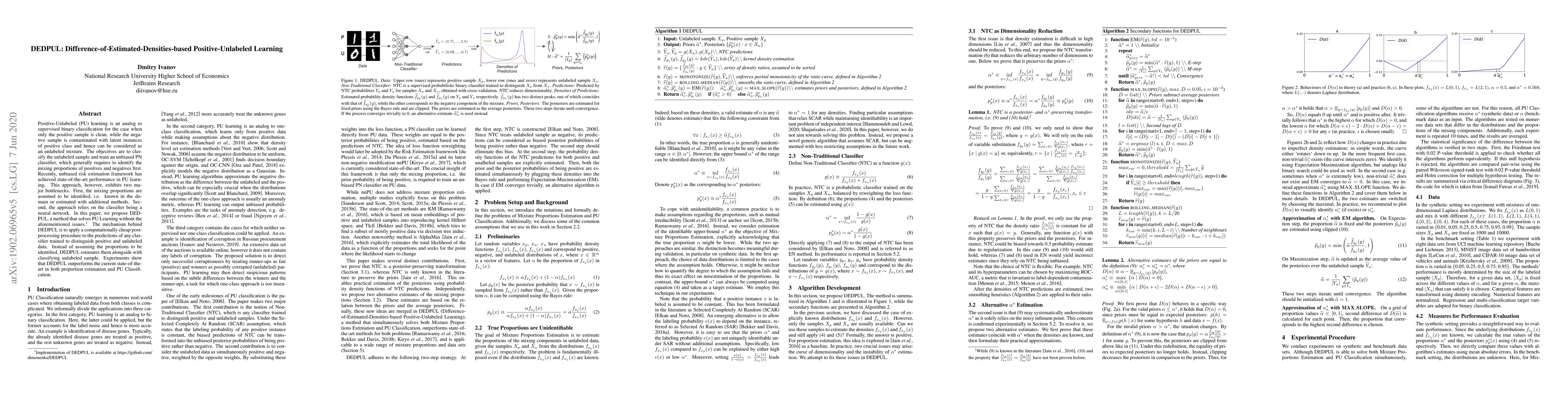 Positive-Unlabeled (PU) learning is an analog to supervised binary classification for the case when only the positive sample is clean, while the negative sample is contaminated with latent instances of positive class and hence can be considered as an unlabeled mixture. The objectives are to classify the unlabeled sample and train an unbiased PN classifier, which generally requires to identify the mixing proportions of positives and negatives first. Recently, unbiased risk estimation framework has achieved state-of-the-art performance in PU learning. This approach, however, exhibits two major bottlenecks. First, the mixing proportions are assumed to be identified, i.e. known in the domain or estimated with additional methods. Second, the approach relies on the classifier being a neural network. In this paper, we propose DEDPUL, a method that solves PU Learning without the aforementioned issues. The mechanism behind DEDPUL is to apply a computationally cheap post-processing procedure to the predictions of any classifier trained to distinguish positive and unlabeled data. Instead of assuming the proportions to be identified, DEDPUL estimates them alongside with classifying unlabeled sample. Experiments show that DEDPUL outperforms the current state-of-the-art in both proportion estimation and PU Classification.