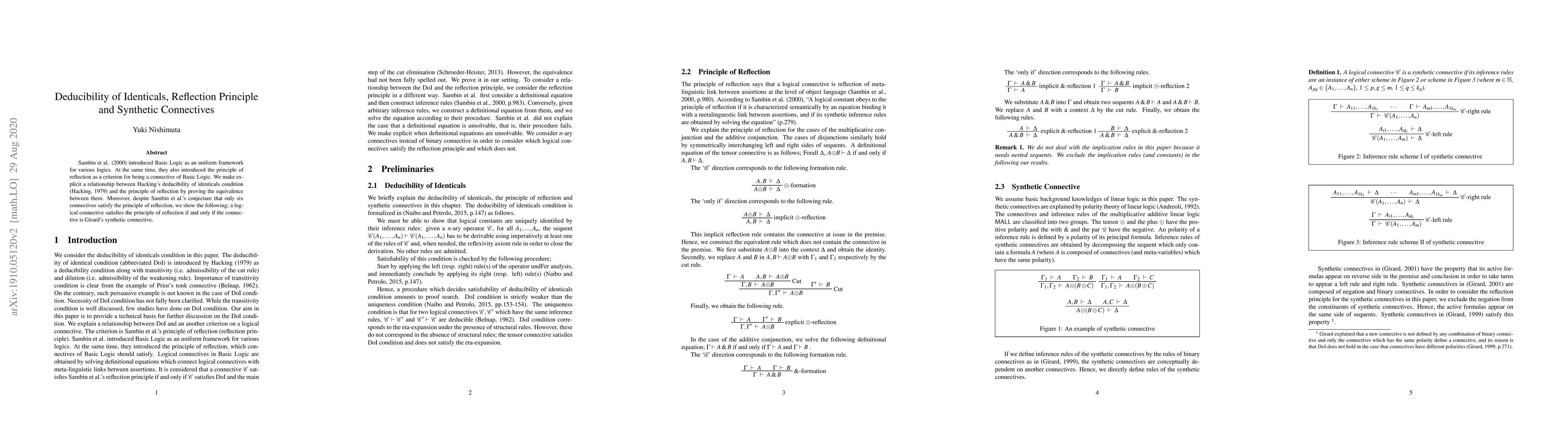 This paper establishes an equivalence between Hacking's deducibility of identicals condition and Sambin et al.'s principle of reflection. It also refutes their conjecture, proving that a logical connective satisfies the principle of reflection if and only if it's Girard's synthetic connective.