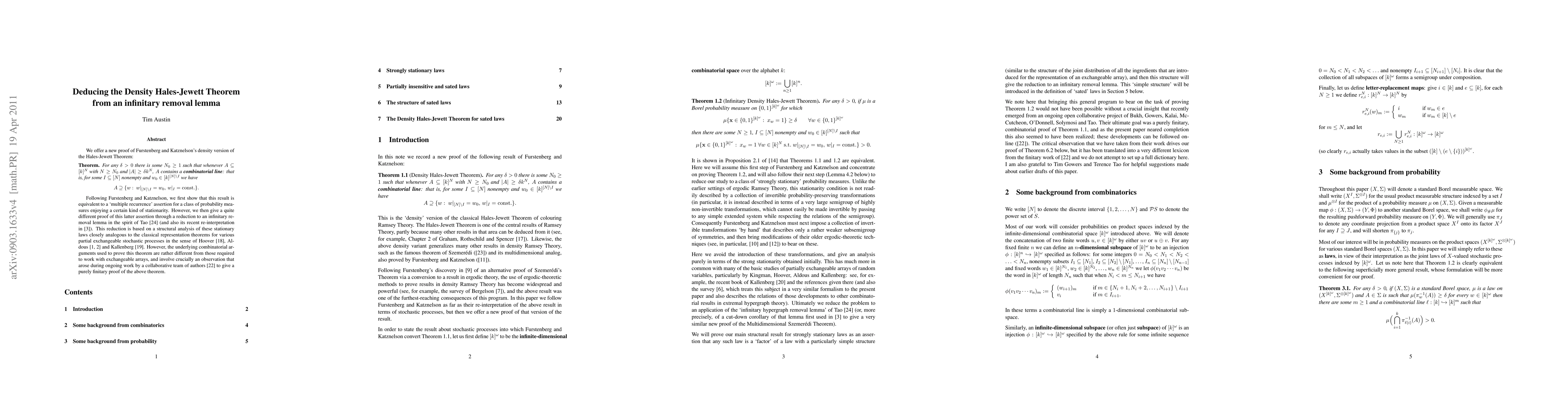 We offer a new proof of Furstenberg and Katznelson's density version of the Hales-Jewett Theorem: For any $\delta > 0$ there is some $N_0 \geq 1$ such that whenever $A \subseteq [k]^N$ with $N \geq N_0$ and $|A|\geq \delta k^N$, $A$ contains a \textbf{combinatorial line}: that is, for some $I \subseteq [N]$ nonempty and $w_0 \in [k]^{[N]\setminus I}$ we have A \supseteq \{w: w|_{[N]\setminus I} = w_0, w|_I = \rm{const.}\}. Following Furstenberg and Katznelson, we first show that this result is equivalent to a `multiple recurrence' assertion for a class of probability measures enjoying a certain kind of stationarity. However, we then give a quite different proof of this latter assertion through a reduction to an infinitary removal lemma in the spirit of Tao's work on infinite random hypergraphs (and also its recent re-interpretation in a new proof of the multidimensional Szemeredi Theorem by the present author). This reduction is based on a structural analysis of these stationary laws closely analogous to the classical representation theorems for various partial exchangeable stochastic processes in the sense of Hoover, Aldous and Kallenberg. However, the underlying combinatorial arguments used to prove this theorem are rather different from those required to work with exchangeable arrays, and involve crucially an observation that arose during ongoing work by a collaborative team of authors to give a purely finitary proof of the above theorem.