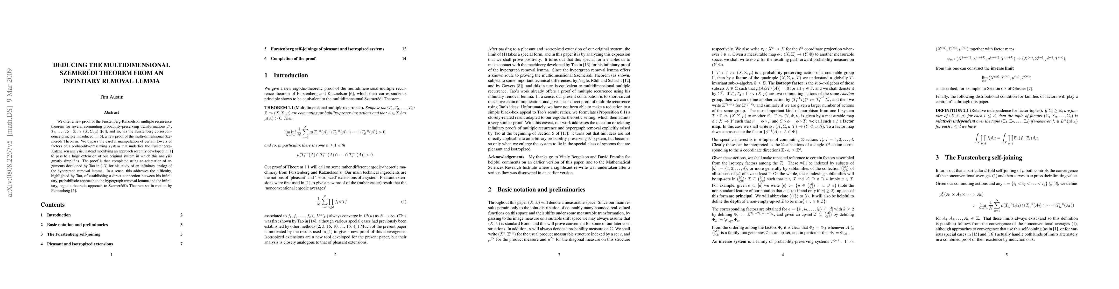 We offer a new proof of the Furstenberg-Katznelson multiple recurrence theorem for several commuting probability-preserving transformations T_1, T_2, >..., T_d: \bbZ\curvearrowright (X,\S,\mu), and so, via the Furstenberg correspondence principle introduced in, a new proof of the multi-dimensional Szemeredi Theorem. We bypass the careful manipulation of certain towers of factors of a probability-preserving system that underlies the Furstenberg-Katznelson analysis, instead modifying an approach recently developed for the study of convergence of nonconventional ergodic averages to pass to a large extension of our original system in which this analysis greatly simplifies. The proof is then completed using an adaptation of arguments developed by Tao for his study of an infinitary analog of the hypergraph removal lemma. In a sense, this addresses the difficulty, highlighted by Tao, of establishing a direct connection between his infinitary, probabilistic approach to the hypergraph removal lemma and the infinitary, ergodic-theoretic approach to Szemeredi's Theorem set in motion by Furstenberg.