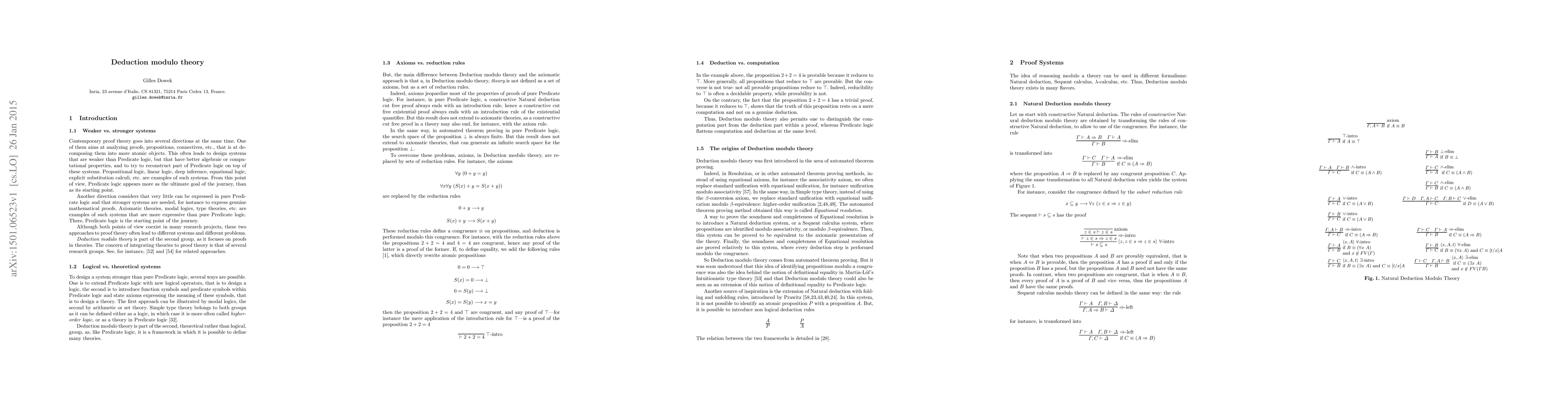 Summary: This paper provides an overview of deduction techniques within the framework of deduction modulo theory, discussing its applications and implications in computational logic and formal verification. It highlights the benefits and challenges of this approach in simplifying complex logical proofs.