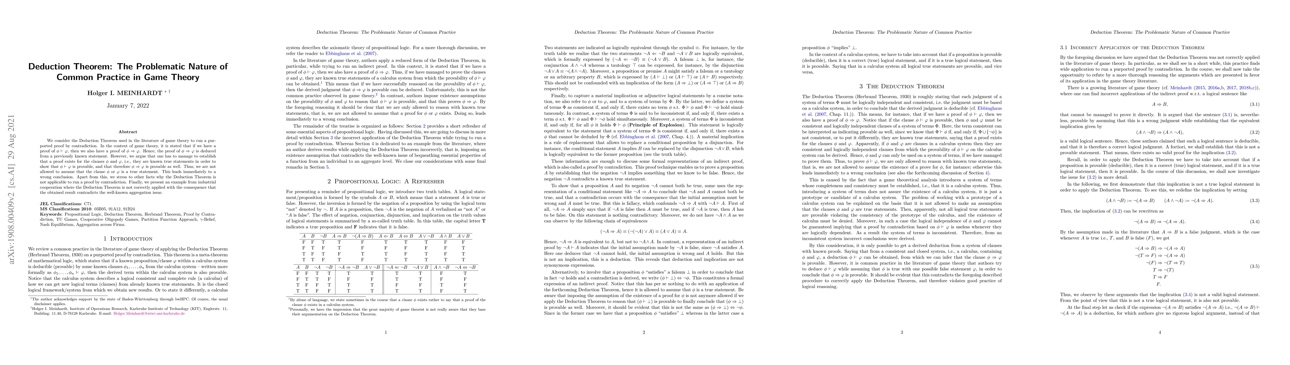 The paper critically reviews the common practice in game theory, specifically focusing on the use of the Deduction Theorem in purported proofs by contradiction.