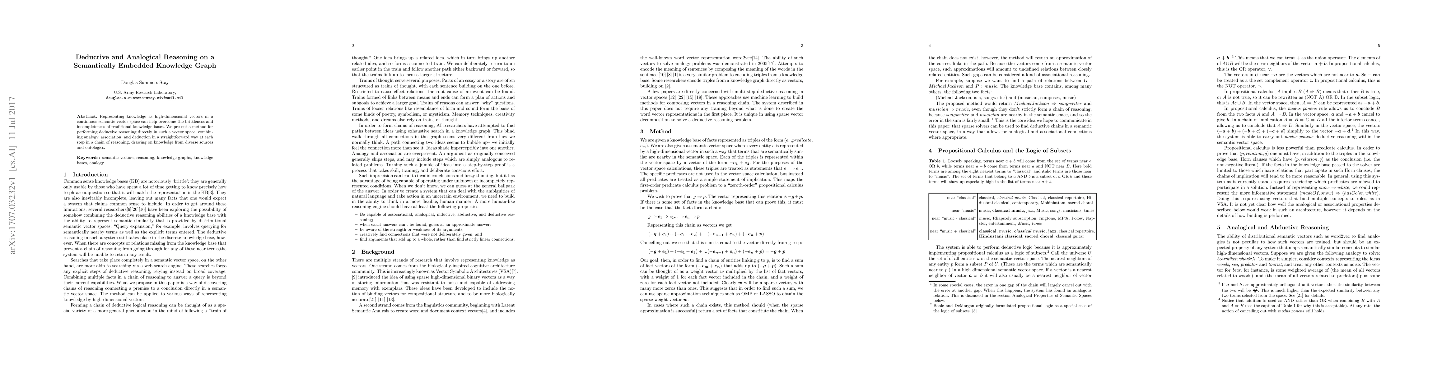 Representing knowledge as high-dimensional vectors in a continuous semantic vector space can help overcome the brittleness and incompleteness of traditional knowledge bases. We present a method for performing deductive reasoning directly in such a vector space, combining analogy, association, and deduction in a straightforward way at each step in a chain of reasoning, drawing on knowledge from diverse sources and ontologies.