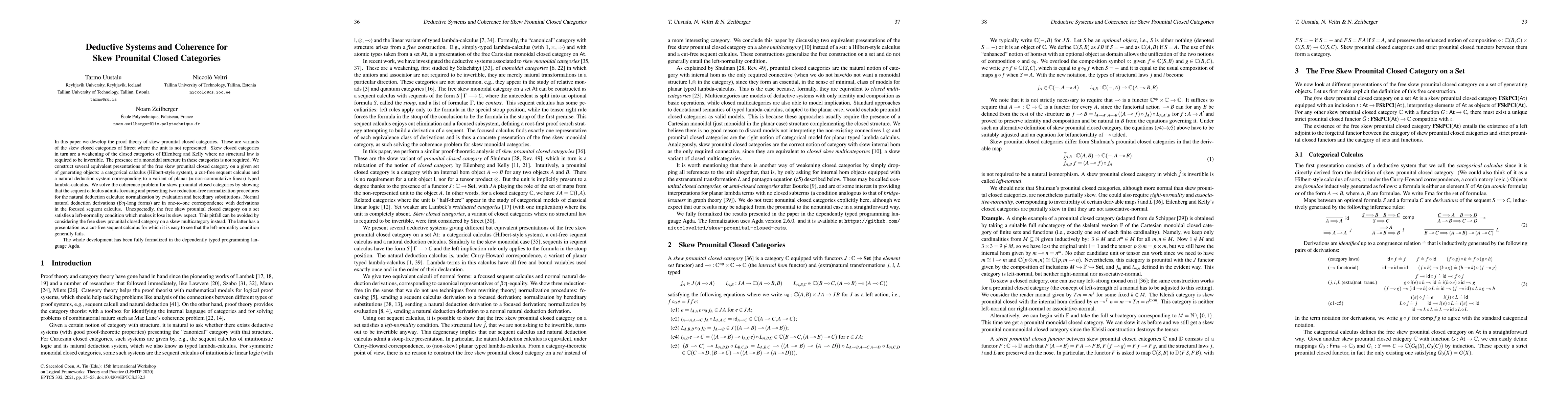 This paper develops the proof theory for skew prounital closed categories, presenting various equivalent systems for the free category, including a categorical calculus, a cut-free sequent calculus, and a natural deduction system. It solves the coherence problem and shows normalization procedures, while also addressing a left-normality condition issue resolved by considering skew multicategories. The work is formalized in Agda.