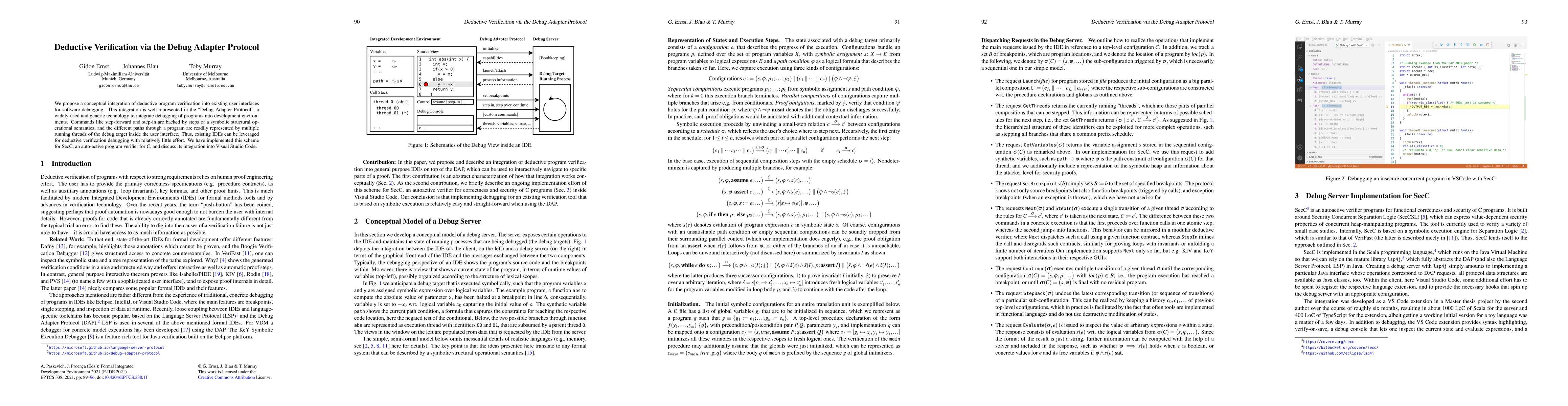 We propose a conceptual integration of deductive program verification into existing user interfaces for software debugging. This integration is well-represented in the "Debug Adapter Protocol", a widely-used and generic technology to integrate debugging of programs into development environments. Commands like step-forward and step-in are backed by steps of a symbolic structural operational semantics, and the different paths through a program are readily represented by multiple running threads of the debug target inside the user interface. Thus, existing IDEs can be leveraged for deductive verification debugging with relatively little effort. We have implemented this scheme for SecC, an auto-active program verifier for C, and discuss its integration into Visual Studio Code.