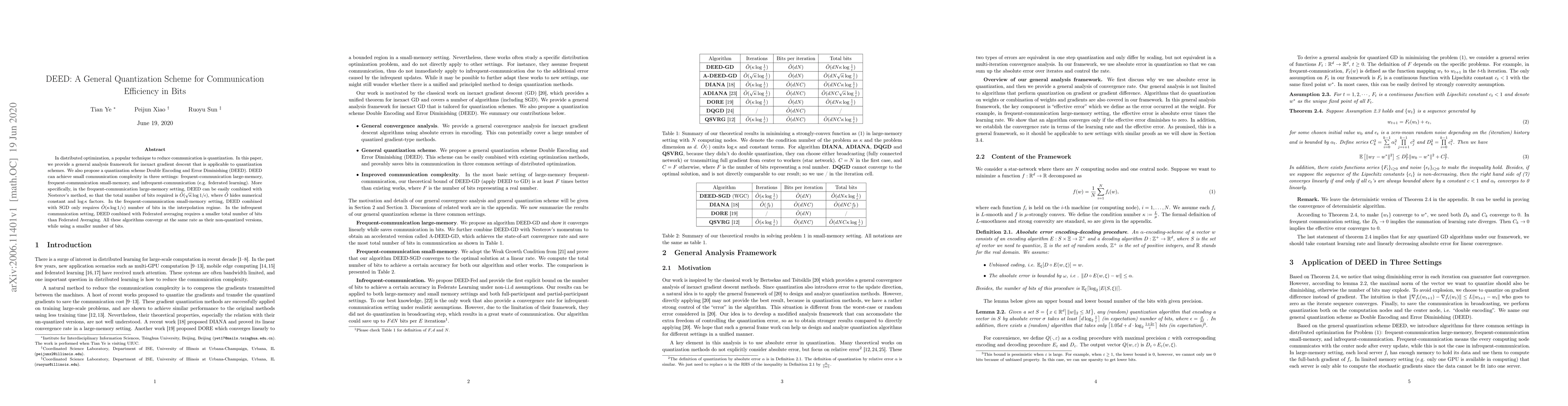 In distributed optimization, a popular technique to reduce communication is quantization. In this paper, we provide a general analysis framework for inexact gradient descent that is applicable to quantization schemes. We also propose a quantization scheme Double Encoding and Error Diminishing (DEED). DEED can achieve small communication complexity in three settings: frequent-communication large-memory, frequent-communication small-memory, and infrequent-communication (e.g. federated learning). More specifically, in the frequent-communication large-memory setting, DEED can be easily combined with Nesterov's method, so that the total number of bits required is $\tilde{O}( \sqrt{\kappa} \log 1/\epsilon )$, where $\tilde{O}$ hides numerical constant and $\log \kappa$ factors. In the frequent-communication small-memory setting, DEED combined with SGD only requires $\tilde{O}( \kappa \log 1/\epsilon)$ number of bits in the interpolation regime. In the infrequent communication setting, DEED combined with Federated averaging requires a smaller total number of bits than Federated Averaging. All these algorithms converge at the same rate as their non-quantized versions, while using a smaller number of bits.