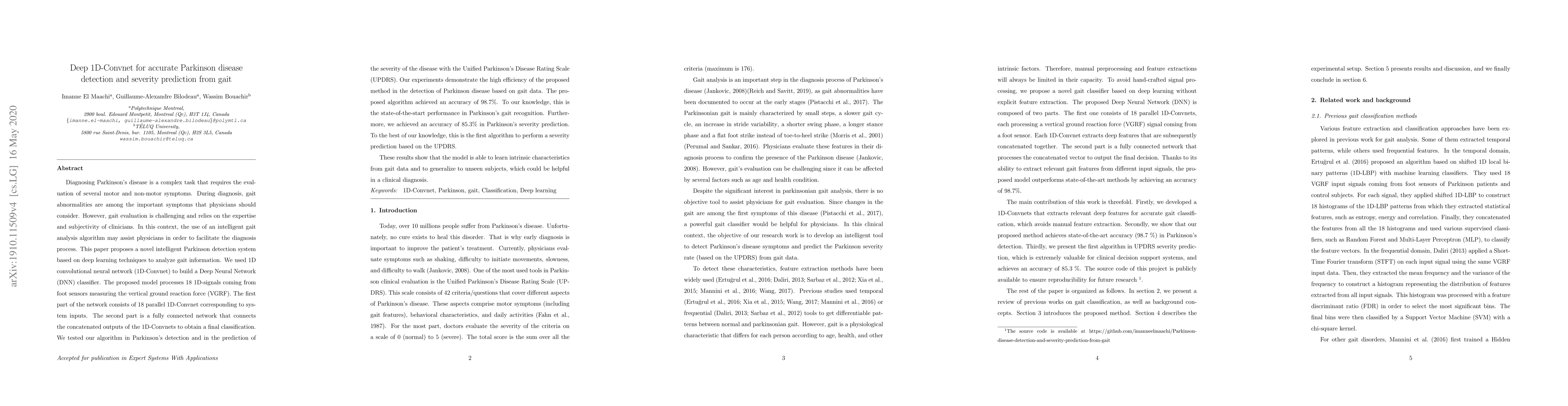 This paper proposes a deep 1D-Convnet model to accurately detect Parkinson's disease and predict its severity based on gait analysis. The model achieved 98.7% accuracy in disease detection and 85.3% in severity prediction, demonstrating state-of-the-art performance and the potential to aid clinical diagnosis.