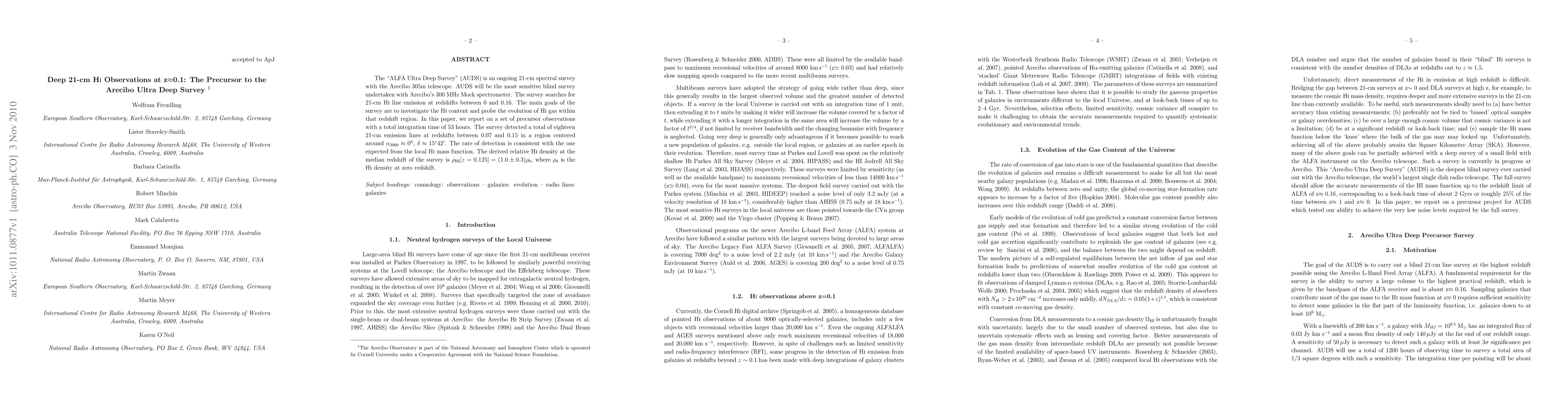 The "ALFA Ultra Deep Survey" (AUDS) is an ongoing 21-cm spectral survey with the Arecibo 305m telescope. AUDS will be the most sensitive blind survey undertaken with Arecibo's 300 MHz Mock spectrometer. The survey searches for 21-cm HI line emission at redshifts between 0 and 0.16. The main goals of the survey are to investigate the HI content and probe the evolution of HI gas within that redshift region. In this paper, we report on a set of precursor observations with a total integration time of 53 hours. The survey detected a total of eighteen 21-cm emission lines at redshifts between 0.07 and 0.15 in a region centered around ra~0:00h, dec= 15:42deg. The rate of detection is consistent with the one expected from the local HI mass function. The derived relative HI density at the median redshift of the survey is rho_HI[z=0.125]=(1.0+/-0.3)*rho_0, where rho_0 is the HI density at zero redshift.