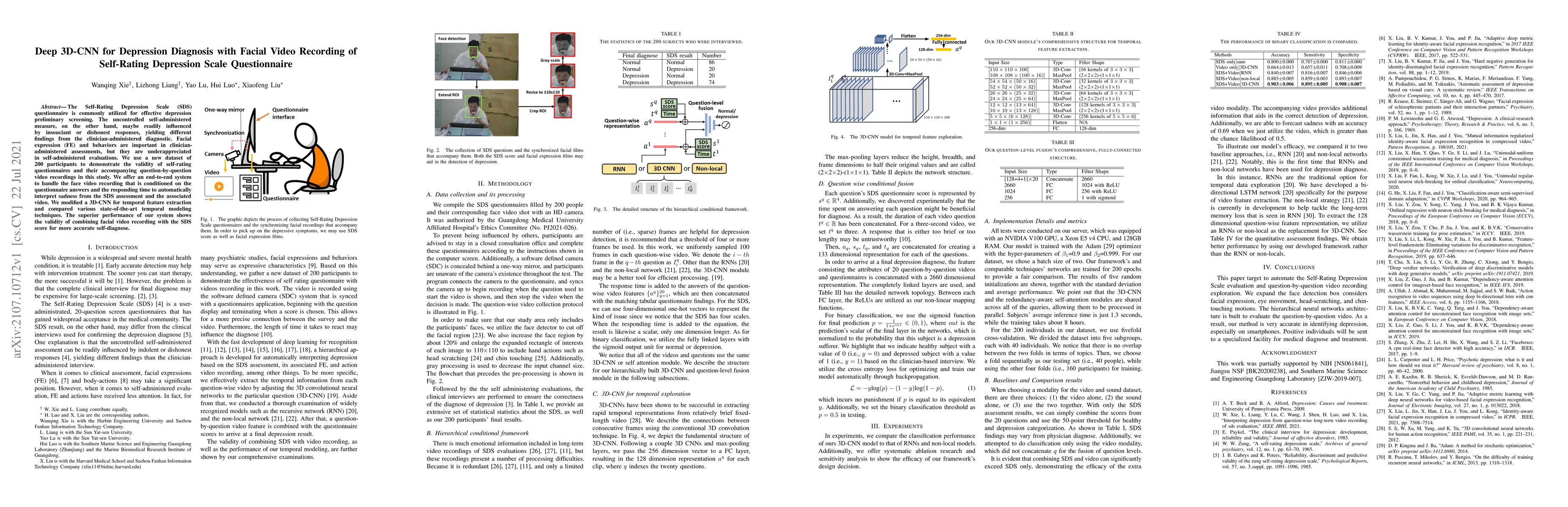 This paper proposes a deep 3D-CNN system to diagnose depression using facial video recordings from participants answering the Self-Rating Depression Scale questionnaire. The study demonstrates that combining facial expressions and video recordings with questionnaire scores can provide a more accurate self-diagnosis than the questionnaire alone.