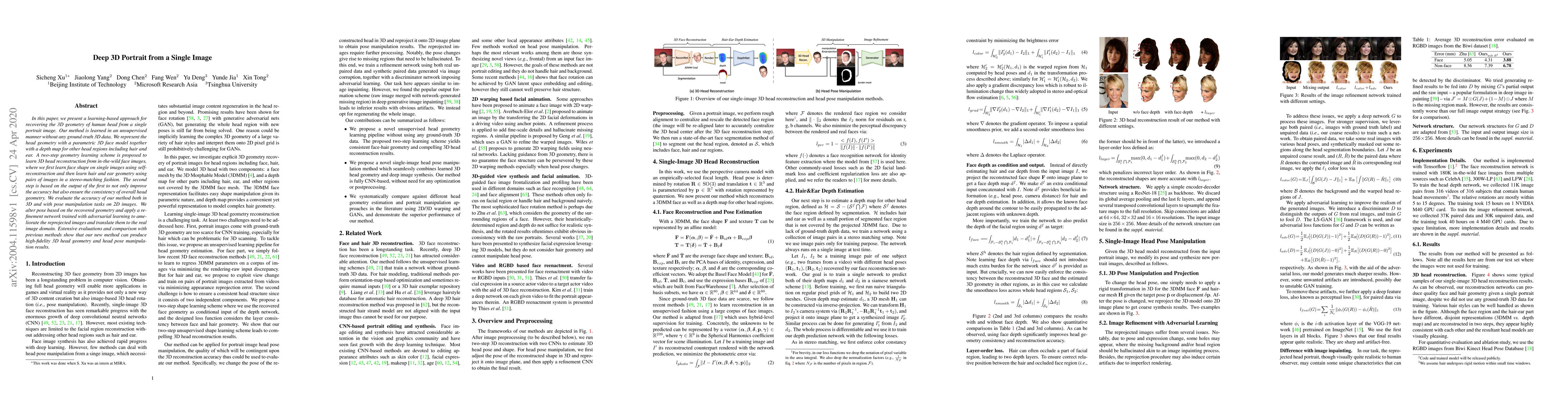 In this paper, we present a learning-based approach for recovering the 3D geometry of human head from a single portrait image. Our method is learned in an unsupervised manner without any ground-truth 3D data. We represent the head geometry with a parametric 3D face model together with a depth map for other head regions including hair and ear. A two-step geometry learning scheme is proposed to learn 3D head reconstruction from in-the-wild face images, where we first learn face shape on single images using self-reconstruction and then learn hair and ear geometry using pairs of images in a stereo-matching fashion. The second step is based on the output of the first to not only improve the accuracy but also ensure the consistency of overall head geometry. We evaluate the accuracy of our method both in 3D and with pose manipulation tasks on 2D images. We alter pose based on the recovered geometry and apply a refinement network trained with adversarial learning to ameliorate the reprojected images and translate them to the real image domain. Extensive evaluations and comparison with previous methods show that our new method can produce high-fidelity 3D head geometry and head pose manipulation results.
