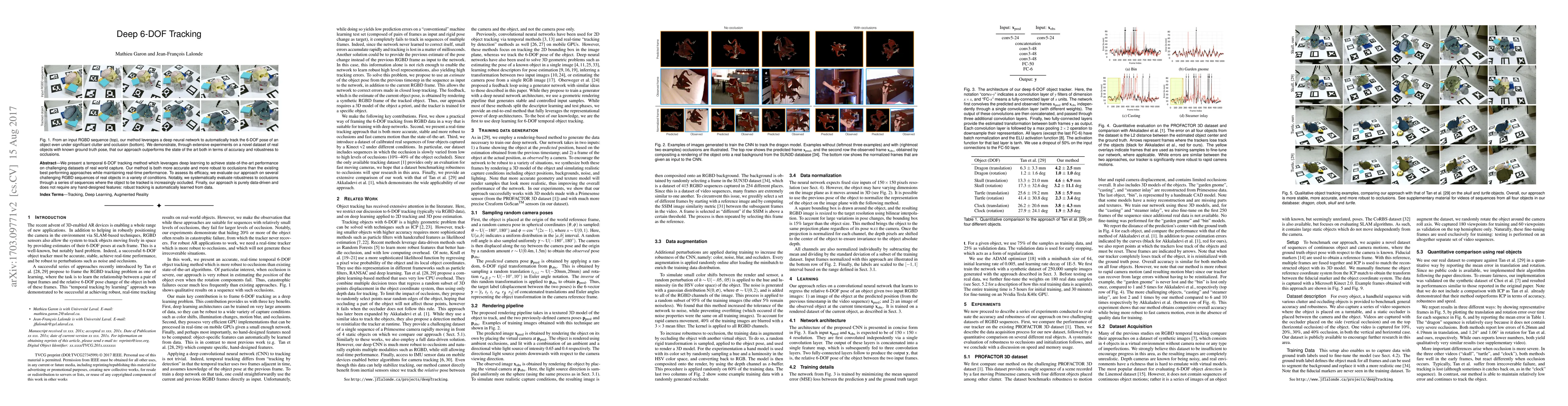 This paper introduces a deep learning-based method for 6-DOF tracking that achieves superior accuracy and robustness to occlusions compared to existing methods, all while maintaining real-time performance. The approach is evaluated on various RGBD sequences under challenging conditions, demonstrating its efficacy and automatic learning from data without hand-designed features.
