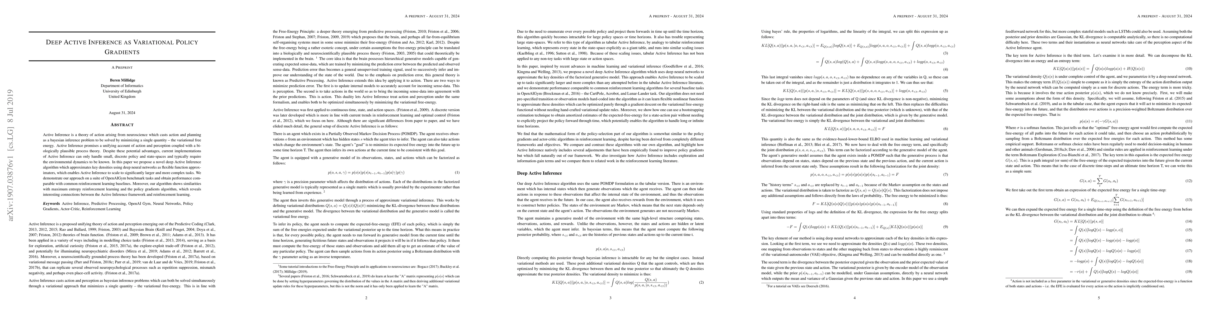 This paper introduces a deep Active Inference algorithm that leverages deep neural networks to scale the theory to larger, complex tasks, demonstrating comparable performance to reinforcement learning baselines on benchmark tasks. The approach reveals connections between Active Inference and reinforcement learning through its variational policy gradient formulation.