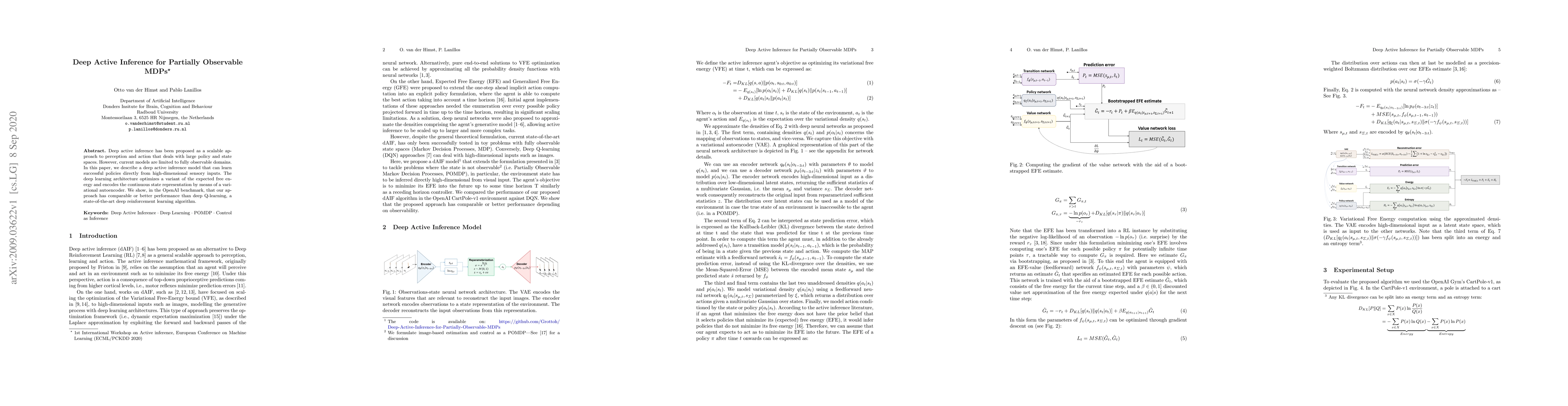 Deep active inference has been proposed as a scalable approach to perception and action that deals with large policy and state spaces. However, current models are limited to fully observable domains. In this paper, we describe a deep active inference model that can learn successful policies directly from high-dimensional sensory inputs. The deep learning architecture optimizes a variant of the expected free energy and encodes the continuous state representation by means of a variational autoencoder. We show, in the OpenAI benchmark, that our approach has comparable or better performance than deep Q-learning, a state-of-the-art deep reinforcement learning algorithm.