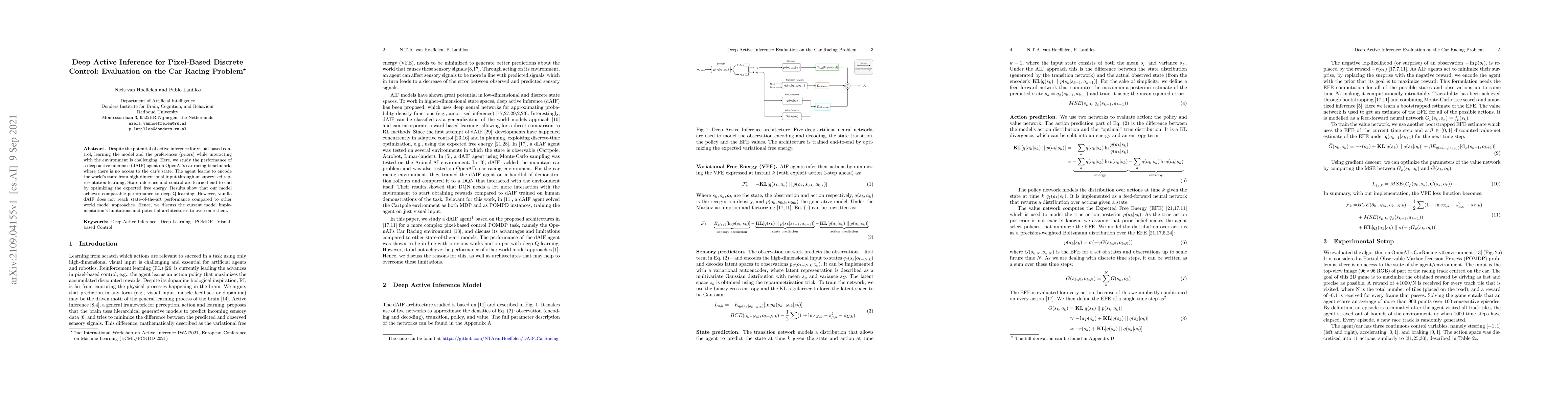 Despite the potential of active inference for visual-based control, learning the model and the preferences (priors) while interacting with the environment is challenging. Here, we study the performance of a deep active inference (dAIF) agent on OpenAI's car racing benchmark, where there is no access to the car's state. The agent learns to encode the world's state from high-dimensional input through unsupervised representation learning. State inference and control are learned end-to-end by optimizing the expected free energy. Results show that our model achieves comparable performance to deep Q-learning. However, vanilla dAIF does not reach state-of-the-art performance compared to other world model approaches. Hence, we discuss the current model implementation's limitations and potential architectures to overcome them.