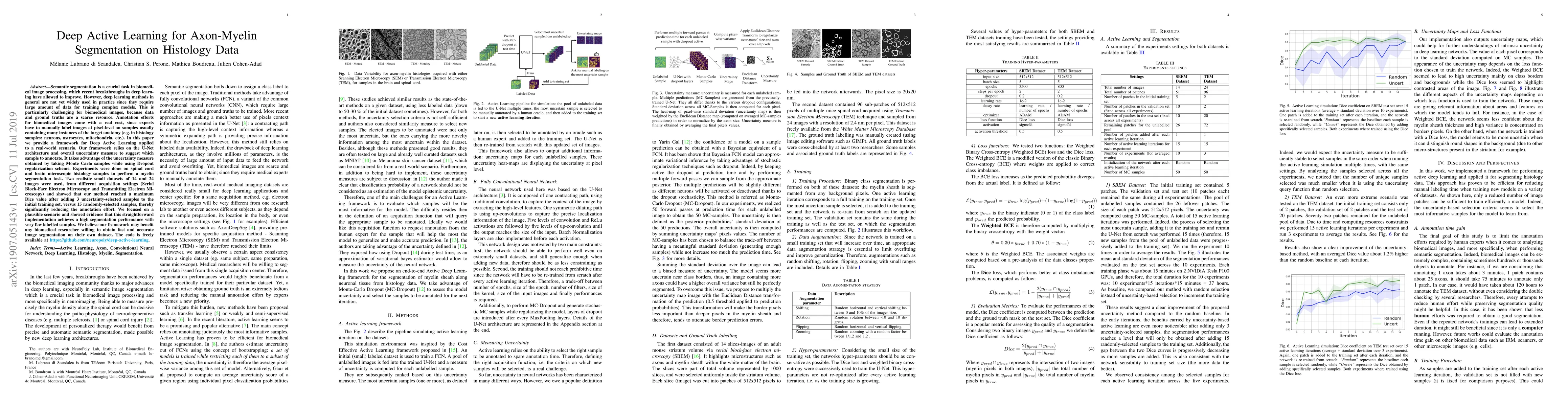 This paper proposes a Deep Active Learning framework for axon-myelin segmentation in histology using a U-Net architecture and uncertainty measures. The method significantly reduces annotation effort by selecting samples with high uncertainty, achieving high segmentation performance with only a few labeled samples.