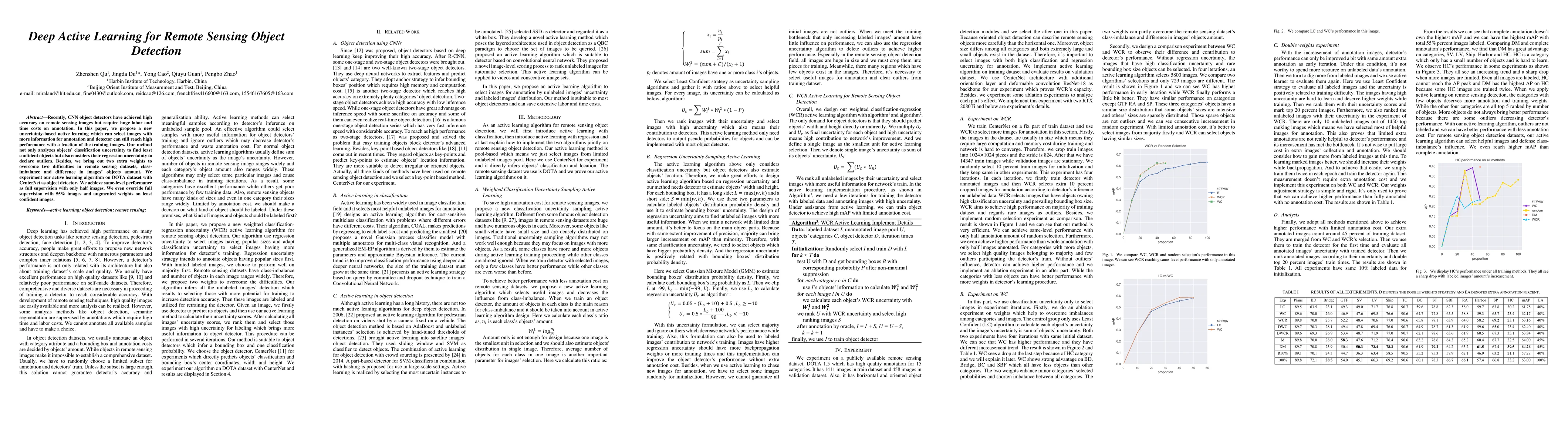 Recently, CNN object detectors have achieved high accuracy on remote sensing images but require huge labor and time costs on annotation. In this paper, we propose a new uncertainty-based active learning which can select images with more information for annotation and detector can still reach high performance with a fraction of the training images. Our method not only analyzes objects' classification uncertainty to find least confident objects but also considers their regression uncertainty to declare outliers. Besides, we bring out two extra weights to overcome two difficulties in remote sensing datasets, class-imbalance and difference in images' objects amount. We experiment our active learning algorithm on DOTA dataset with CenterNet as object detector. We achieve same-level performance as full supervision with only half images. We even override full supervision with 55% images and augmented weights on least confident images.
