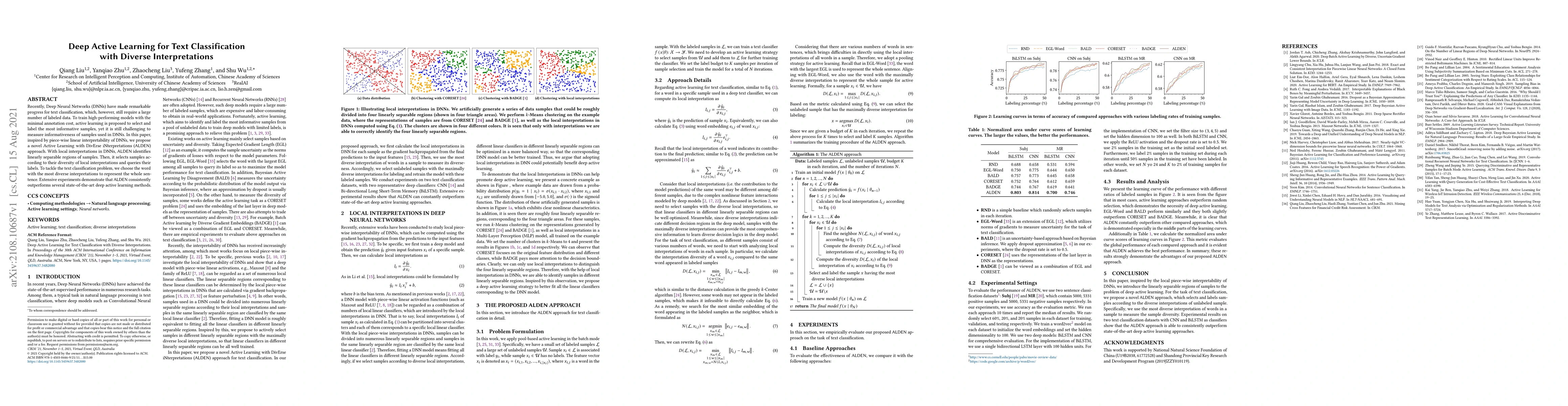 This paper proposes ALDEN, an Active Learning with Diverse Interpretations approach for text classification using Deep Neural Networks. ALDEN identifies informative samples based on their diverse local interpretations and selects them for labeling, achieving better performance with minimal annotation costs compared to other methods.