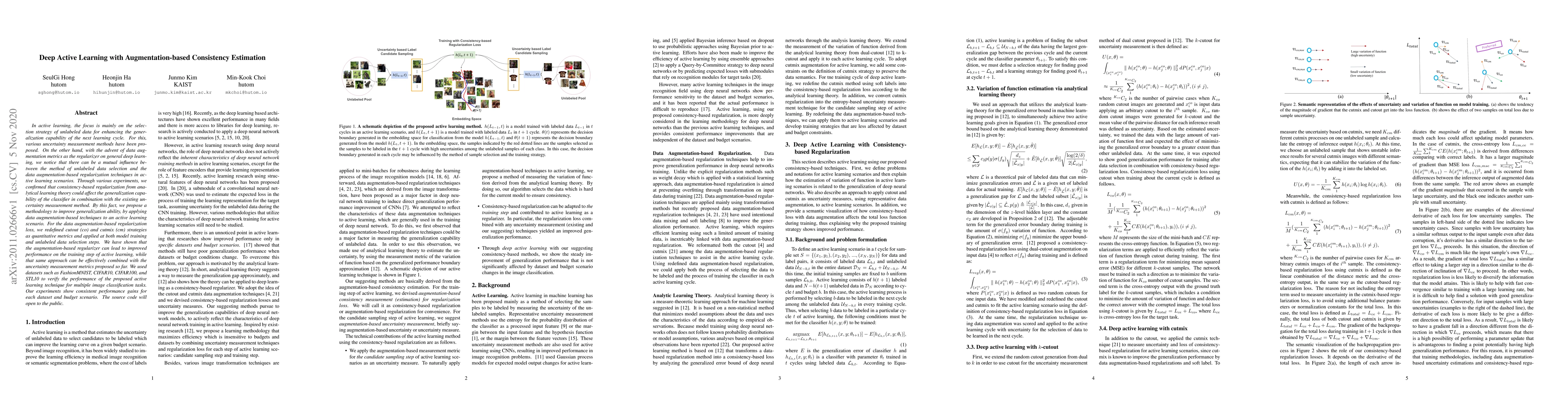 This paper proposes a deep active learning method that integrates data augmentation-based consistency estimation with uncertainty measurement for unlabeled data selection, demonstrating improved generalization and performance across multiple image classification tasks. The approach redefines cutout and cutmix strategies for regularization, showing consistent gains on datasets like FashionMNIST, CIFAR10, CIFAR100, and STL10.