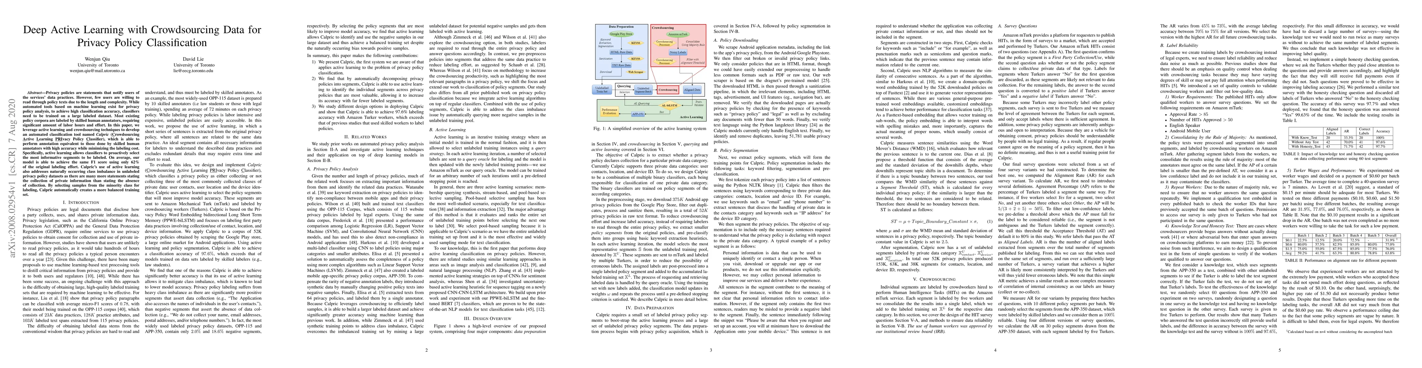 This paper introduces Calpric, an automated classification tool that uses active learning and crowdsourcing to efficiently label privacy policies for machine learning. It achieves high classification accuracy with only 62% of the original labeling effort, addressing class imbalance by prioritizing minority class samples.