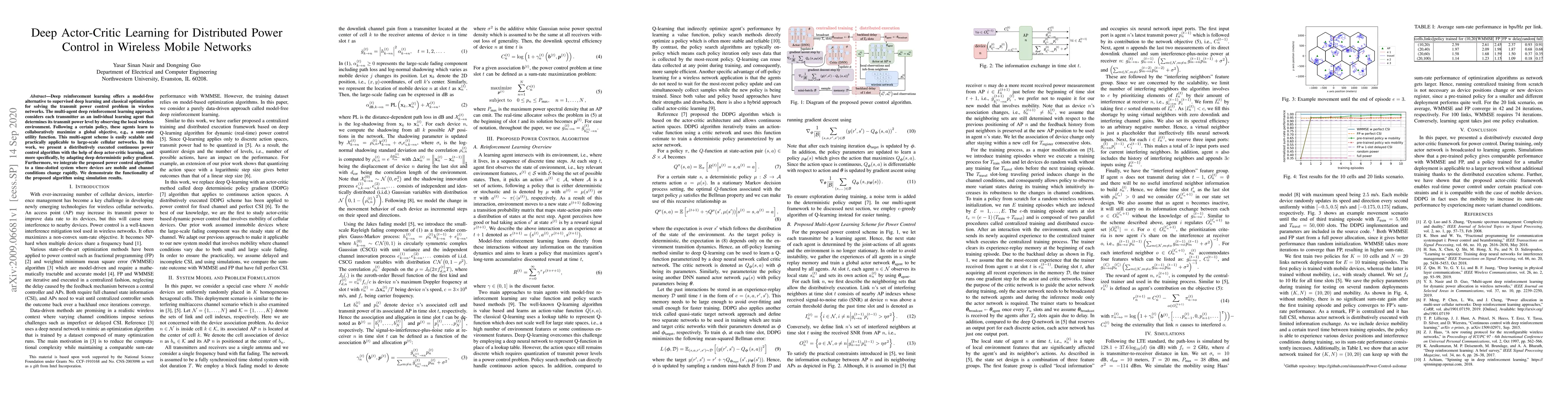 This paper proposes a deep actor-critic reinforcement learning approach for distributed power control in wireless mobile networks. The method leverages multi-agent deep reinforcement learning to enable transmitters to adaptively determine their power levels based on local observations, aiming to maximize a global utility function like sum-rate. Simulation results validate the effectiveness of the proposed algorithm in dynamic, time-slotted environments.