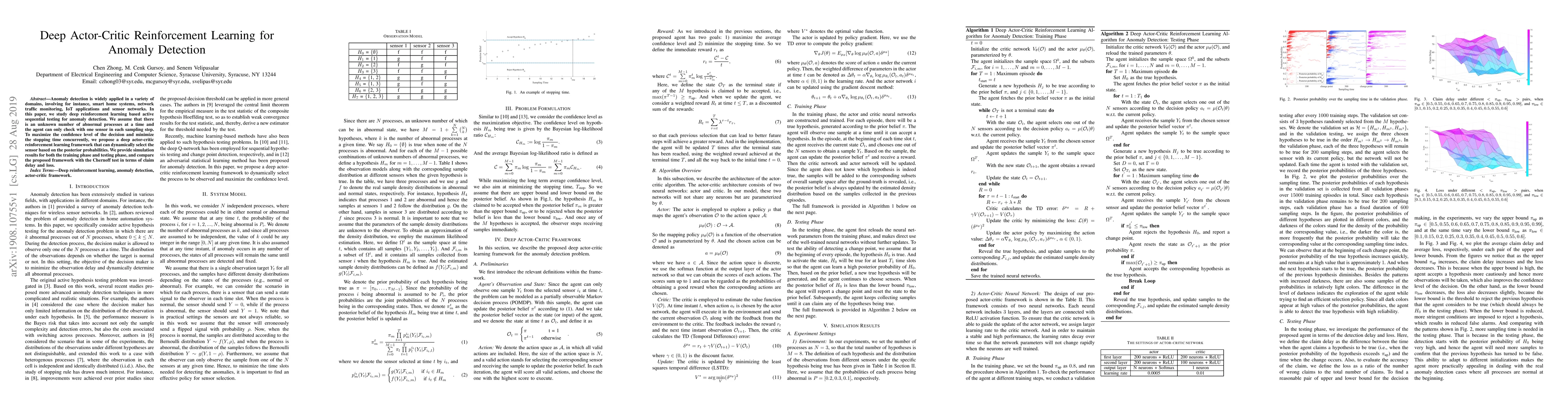 This paper proposes a deep actor-critic reinforcement learning framework for active sequential testing in anomaly detection. The framework dynamically selects sensors based on posterior probabilities to maximize decision confidence and minimize stopping time, with simulation results comparing its performance against the Chernoff test.