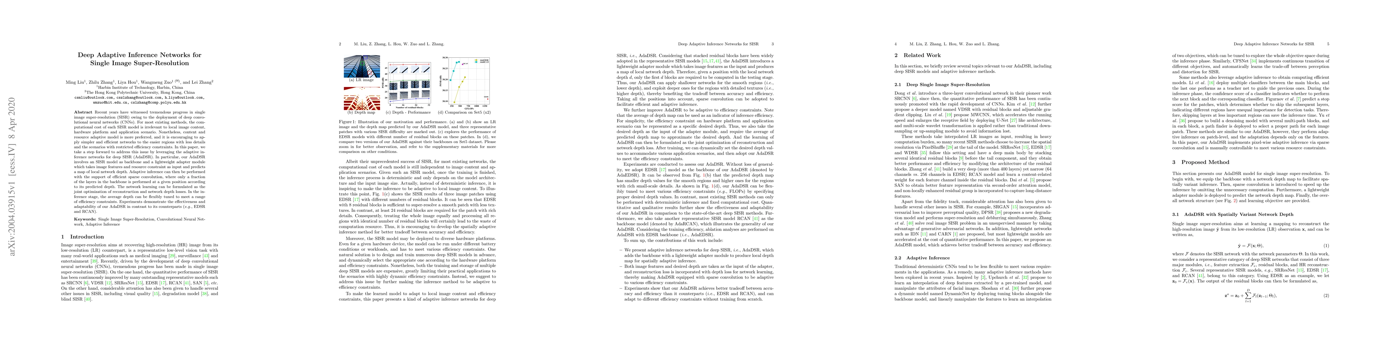 This paper proposes AdaDSR, an adaptive inference network for single image super-resolution that dynamically adjusts the network depth based on local image content and resource constraints. The method employs a lightweight adapter module to predict local network depth, enabling efficient sparse convolution and flexible tuning of average depth during inference.