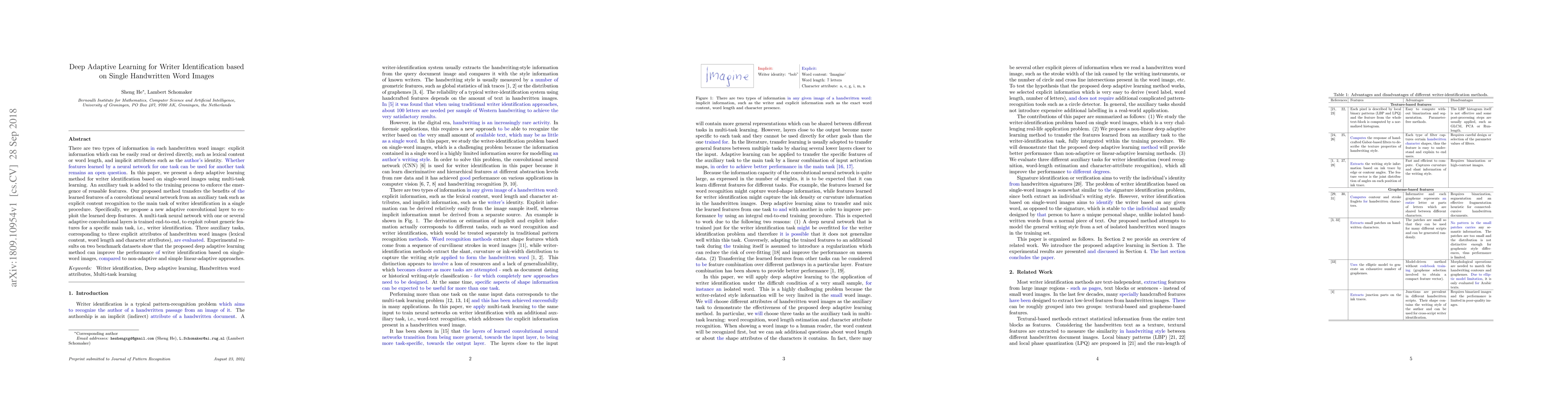This paper proposes a deep adaptive learning method for writer identification using single handwritten word images, leveraging multi-task learning to transfer features from auxiliary tasks like lexical content recognition to the main task. Experimental results show improved performance over non-adaptive methods.