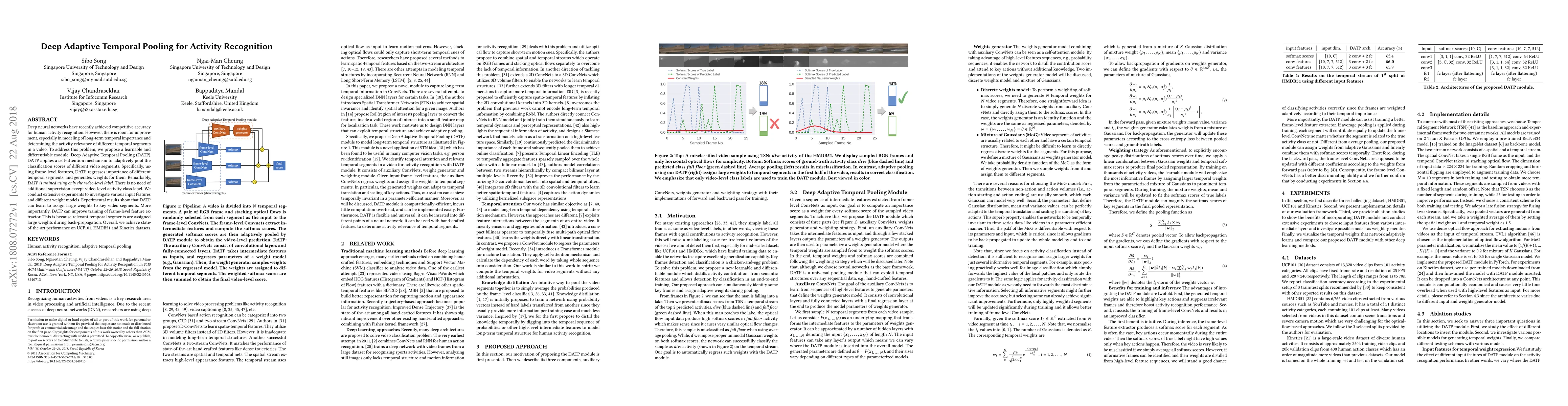 This paper proposes Deep Adaptive Temporal Pooling (DATP) to enhance human activity recognition by modeling long-term temporal importance. DATP uses self-attention to adaptively weight different video segments, leading to state-of-the-art performance on UCF101, HMDB51, and Kinetics datasets.