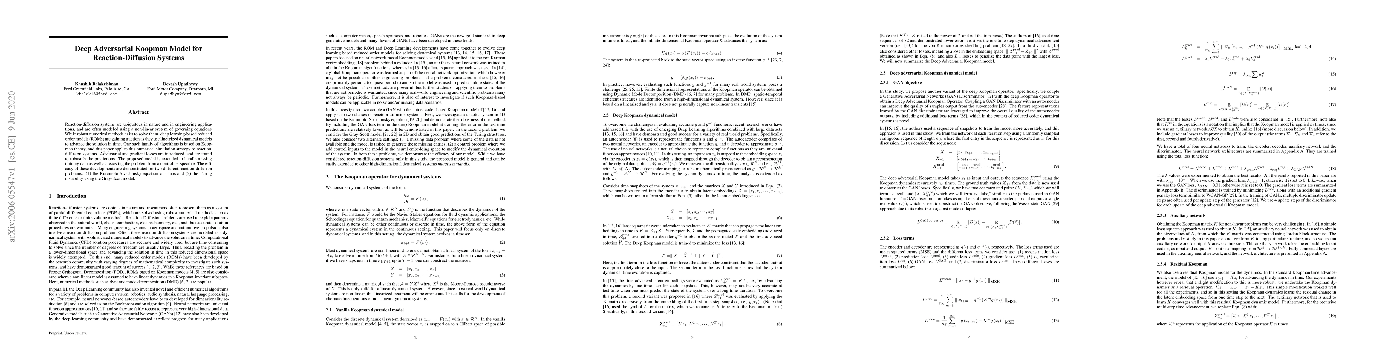 This paper proposes a Deep Adversarial Koopman Model to simulate reaction-diffusion systems, incorporating adversarial and gradient losses to enhance robustness. The model is demonstrated on the Kuramoto-Sivashinsky equation and the Gray-Scott model, showcasing its effectiveness in handling missing data and control perspectives.