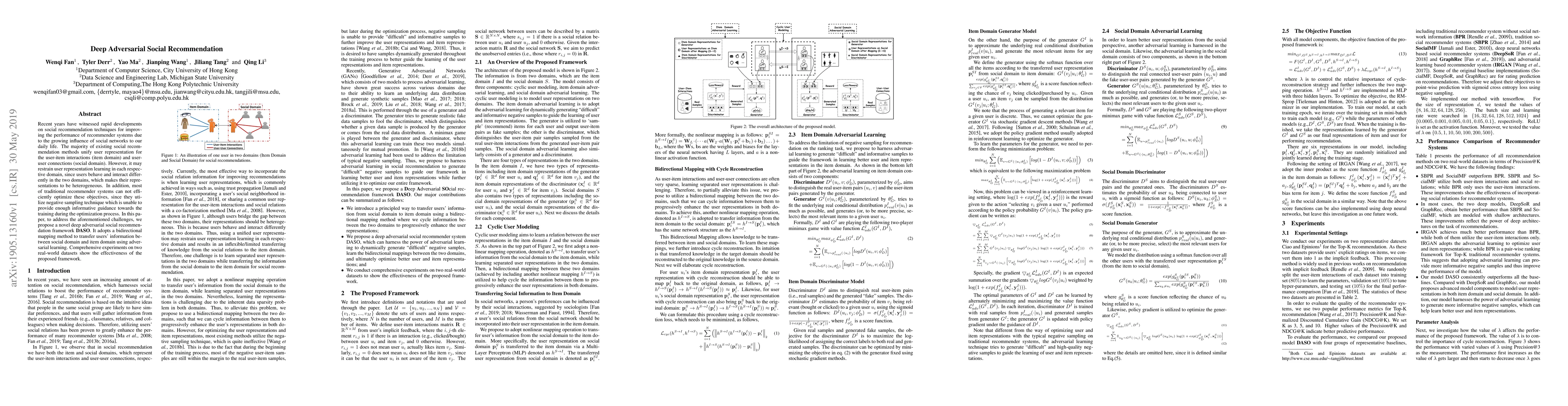 This paper proposes a novel deep adversarial social recommendation framework (DASO) to enhance recommender systems by learning heterogeneous user representations from both social and item domains. DASO uses adversarial learning for bidirectional information transfer, addressing the limitations of traditional methods and demonstrating improved performance on real-world datasets.
