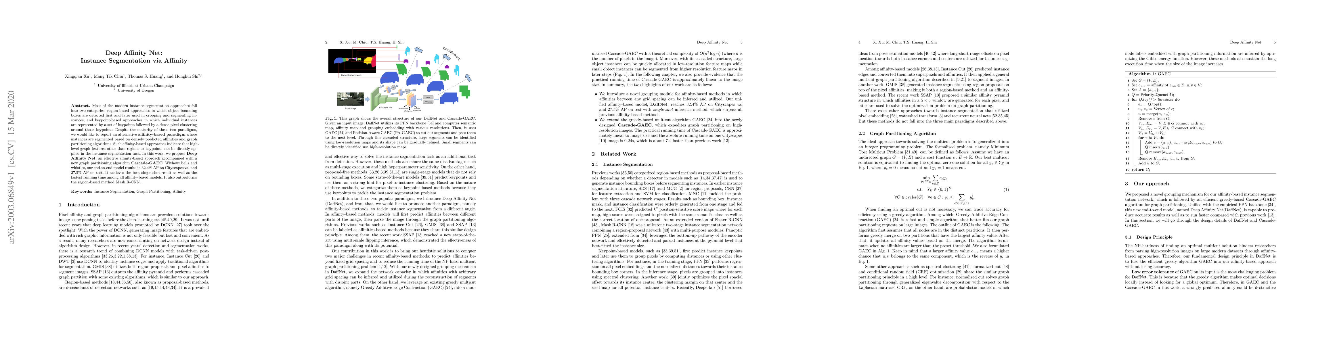 Deep Affinity Net proposes an alternative affinity-based approach for instance segmentation using densely predicted affinities and a new graph partitioning algorithm, achieving competitive accuracy and speed compared to region-based and keypoint-based methods.