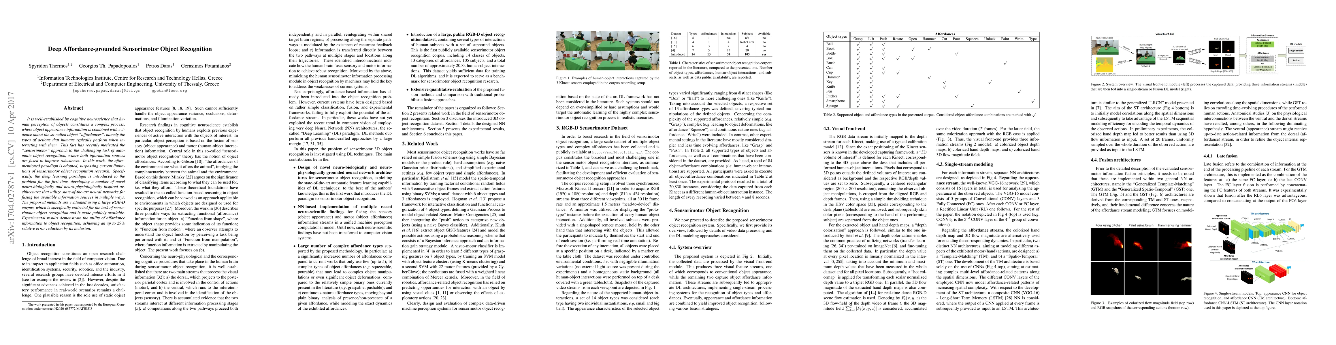 It is well-established by cognitive neuroscience that human perception of objects constitutes a complex process, where object appearance information is combined with evidence about the so-called object "affordances", namely the types of actions that humans typically perform when interacting with them. This fact has recently motivated the "sensorimotor" approach to the challenging task of automatic object recognition, where both information sources are fused to improve robustness. In this work, the aforementioned paradigm is adopted, surpassing current limitations of sensorimotor object recognition research. Specifically, the deep learning paradigm is introduced to the problem for the first time, developing a number of novel neuro-biologically and neuro-physiologically inspired architectures that utilize state-of-the-art neural networks for fusing the available information sources in multiple ways. The proposed methods are evaluated using a large RGB-D corpus, which is specifically collected for the task of sensorimotor object recognition and is made publicly available. Experimental results demonstrate the utility of affordance information to object recognition, achieving an up to 29% relative error reduction by its inclusion.