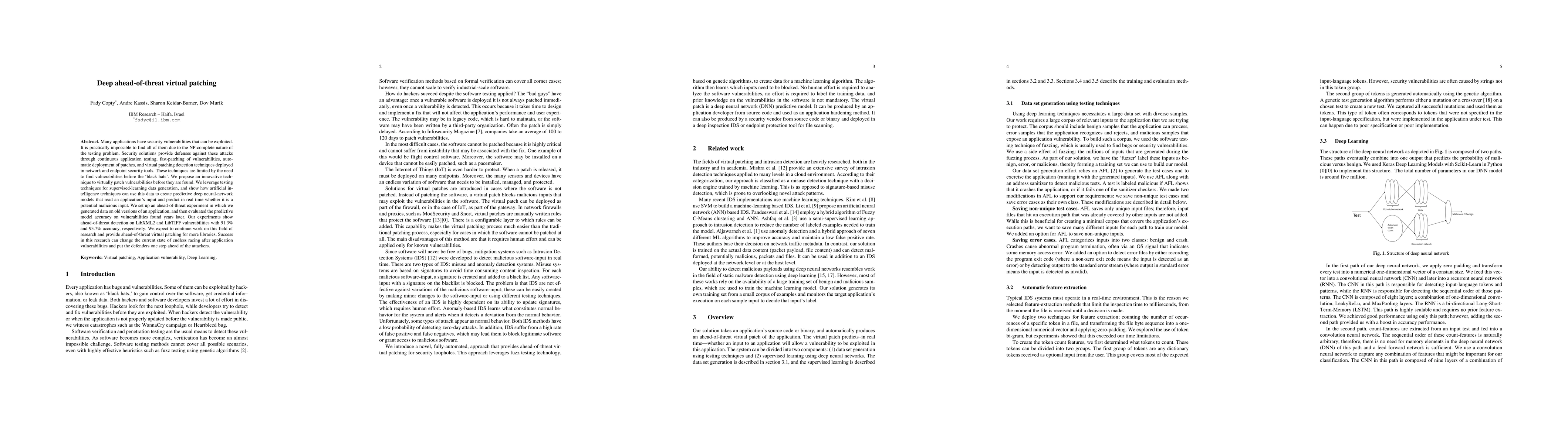 Many applications have security vulnerabilities that can be exploited. It is practically impossible to find all of them due to the NP-complete nature of the testing problem. Security solutions provide defenses against these attacks through continuous application testing, fast-patching of vulnerabilities, automatic deployment of patches, and virtual patching detection techniques deployed in network and endpoint security tools. These techniques are limited by the need to find vulnerabilities before the black-hats. We propose an innovative technique to virtually patch vulnerabilities before they are found. We leverage testing techniques for supervised-learning data generation, and show how artificial intelligence techniques can use this data to create predictive deep neural-network models that read an application's input and predict in real time whether it is a potential malicious input. We set up an ahead-of-threat experiment in which we generated data on old versions of an application, and then evaluated the predictive model accuracy on vulnerabilities found years later. Our experiments show ahead-of-threat detection on LibXML2 and LibTIFF vulnerabilities with 91.3% and 93.7% accuracy, respectively. We expect to continue work on this field of research and provide ahead-of-threat virtual patching for more libraries. Success in this research can change the current state of endless racing after application vulnerabilities and put the defenders one step ahead of the attackers