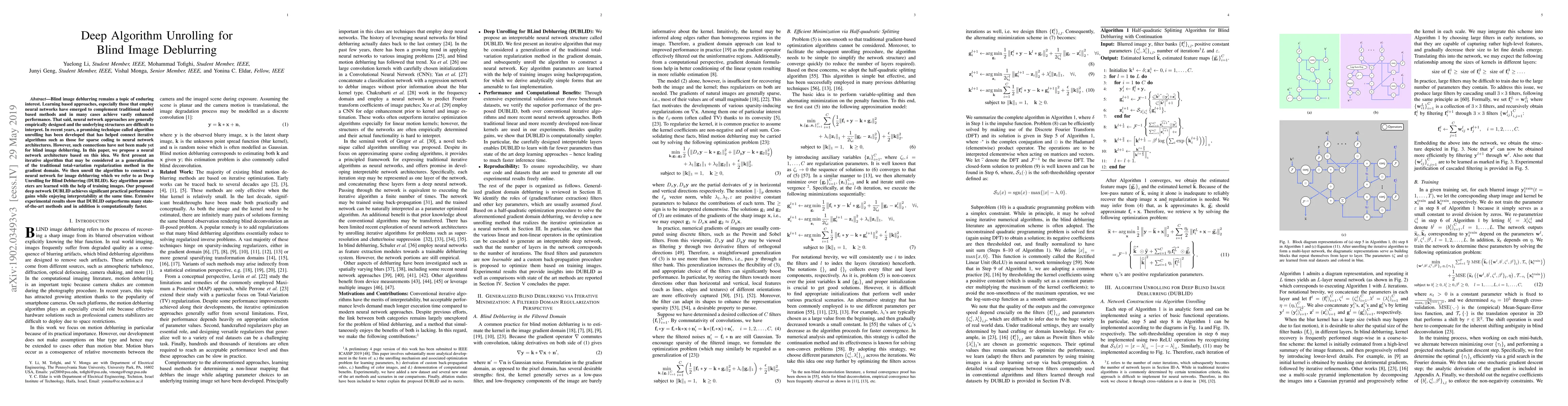 This paper proposes a neural network architecture called Deep Unrolling for Blind Deblurring (DUBLID) that unrolls an iterative algorithm for blind image deblurring, achieving significant performance gains and interpretability while being faster than state-of-the-art methods.