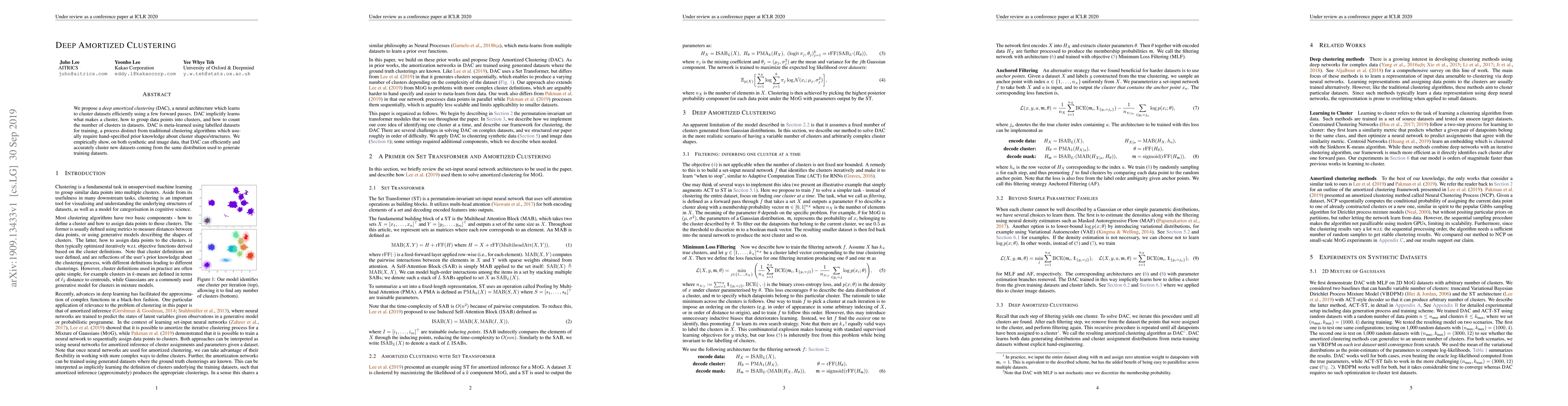 A new neural architecture called Deep Amortized Clustering (DAC) efficiently clusters datasets using a few forward passes. It can accurately cluster new datasets from the same distribution as its training data.