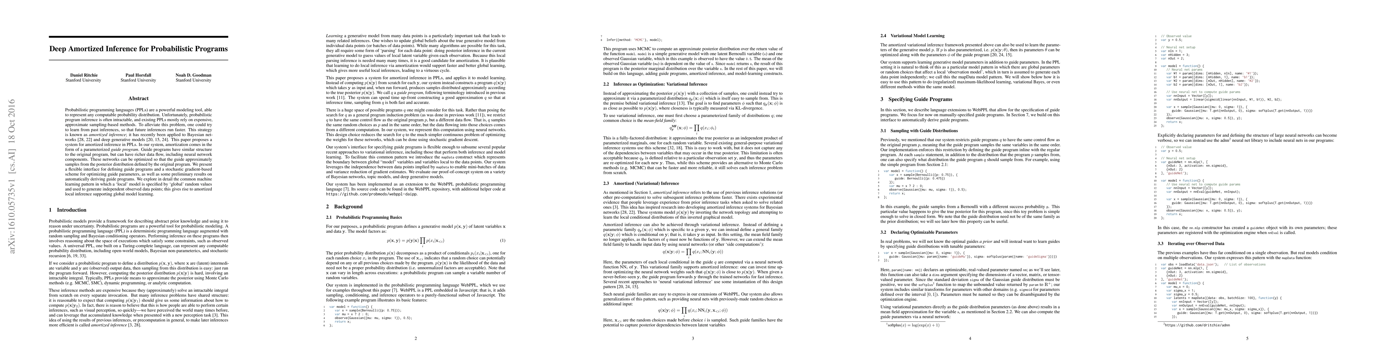 This paper introduces a system for amortized inference in probabilistic programming languages (PPLs) using parameterized guide programs that incorporate neural networks to approximate posterior distributions, optimizing these guides to speed up inference. The system leverages stochastic gradient methods and presents a flexible interface for defining and optimizing these guide programs.
