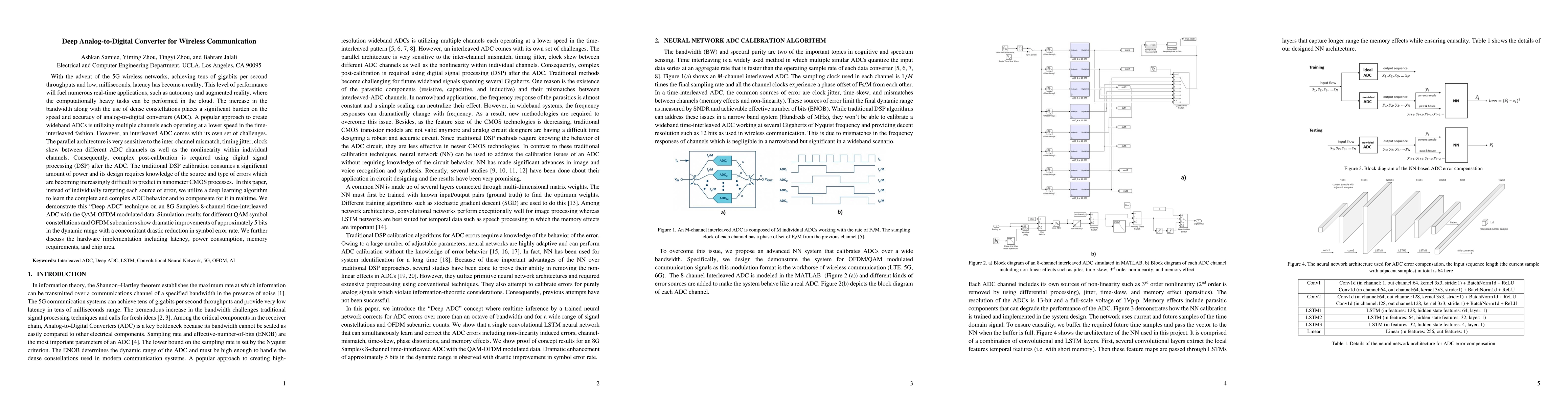 This paper proposes a deep learning-based approach to enhance the performance of time-interleaved analog-to-digital converters (ADC) in 5G wireless communication, achieving significant improvements in dynamic range and symbol error rate while addressing challenges like inter-channel mismatch and timing jitter. The "Deep ADC" technique demonstrates substantial benefits in hardware metrics such as latency, power consumption, and chip area.