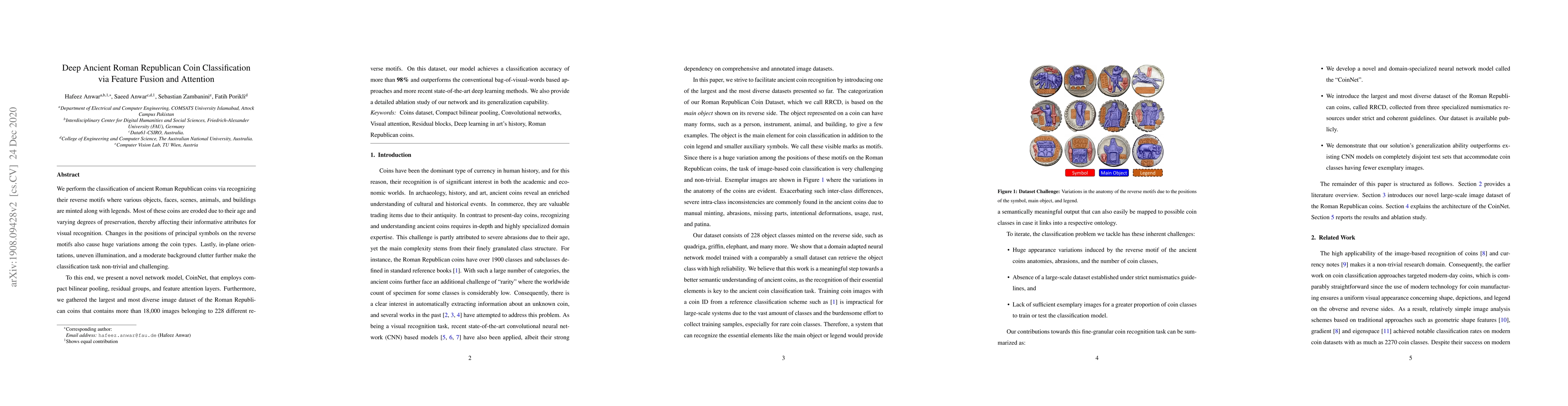 This paper introduces CoinNet, a novel deep learning model for classifying ancient Roman Republican coins based on eroded reverse motifs, achieving over 98% accuracy. The model uses feature fusion, attention layers, and a large dataset of 18,000 images, outperforming traditional and recent deep learning methods.