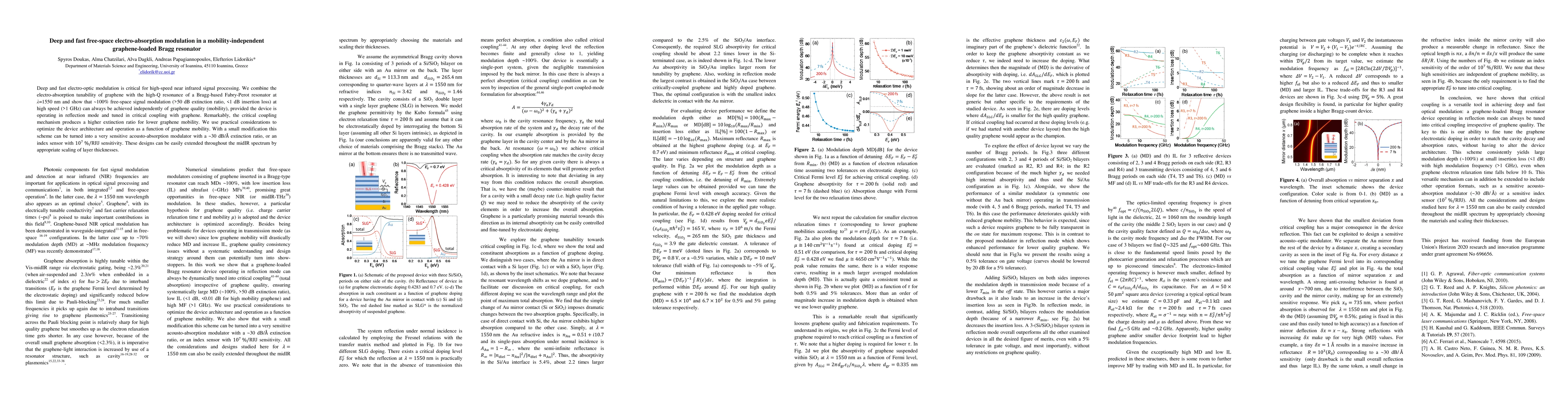 This paper presents a graphene-loaded Bragg resonator that achieves deep and fast electro-absorption modulation at 1550 nm, demonstrating >50 dB extinction ratio and <1 dB insertion loss at >1 GHz, independent of graphene mobility. The critical coupling mechanism enhances modulation efficiency for lower graphene mobility, and the design can be adapted for acousto-absorption modulation or as a highly sensitive index sensor.